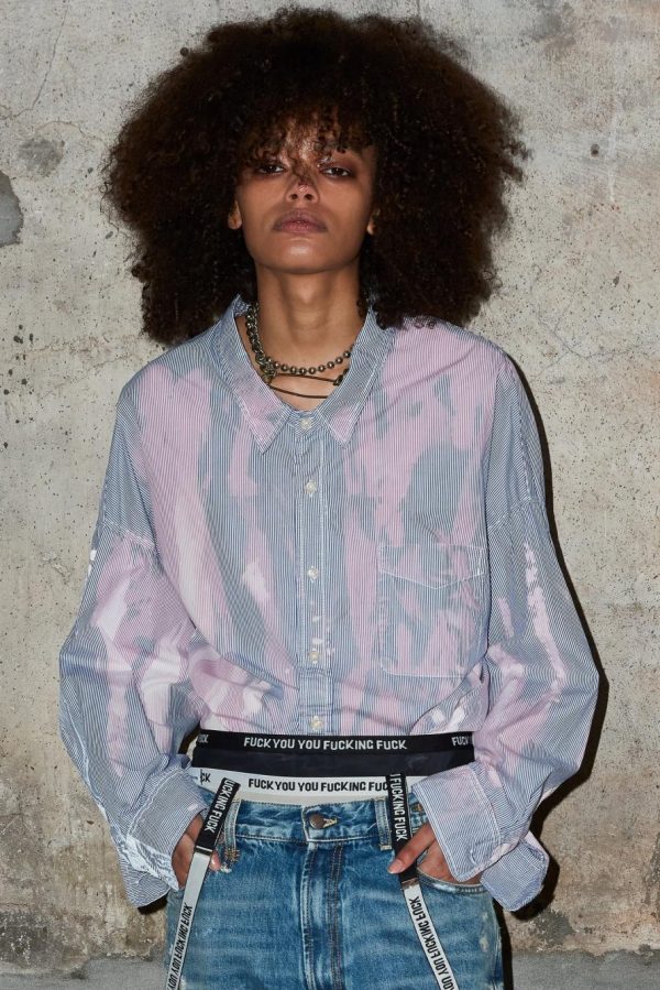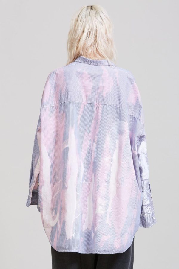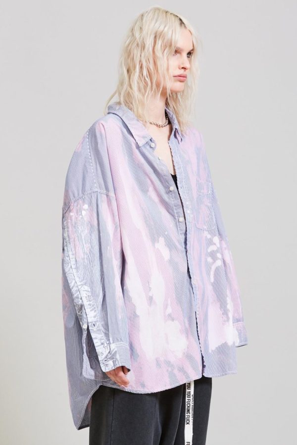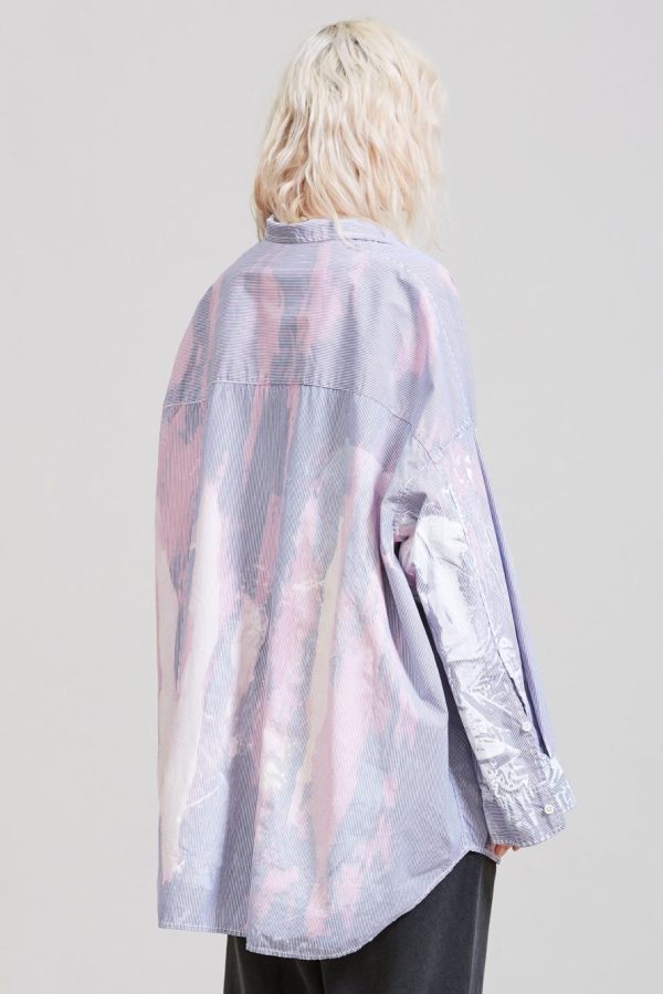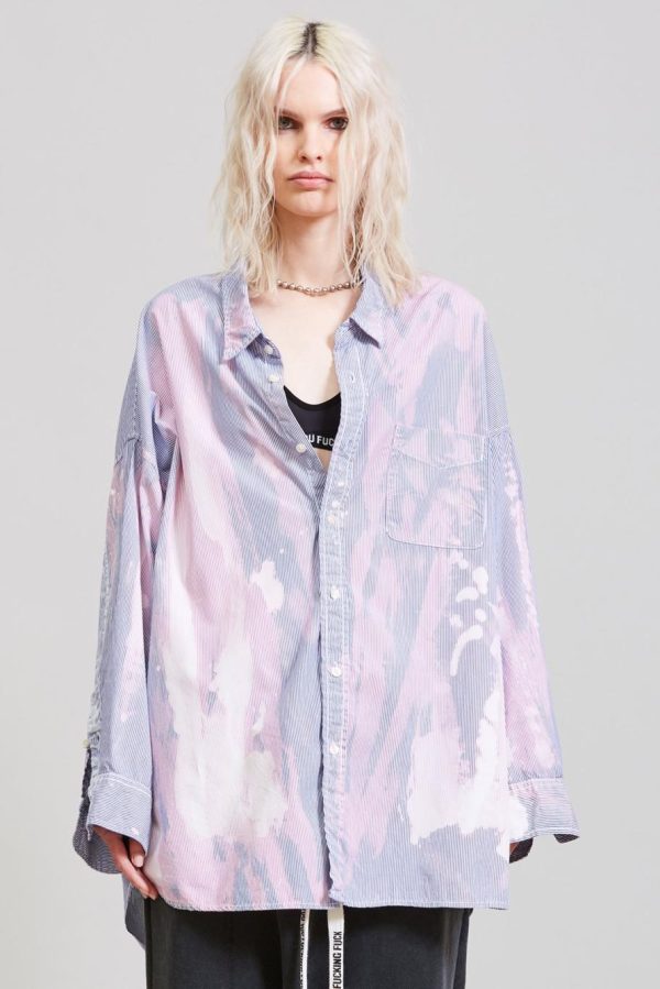 Bleached drop neck oxford shirt made with fine cotton poplin in blue pinstripe. Oversized drop neck button down shirt with bleached brush stroke effect for deconstructed look. This shirt was enzyme washed with softener to make garment soft to the touch