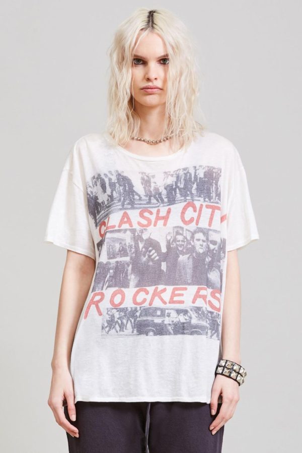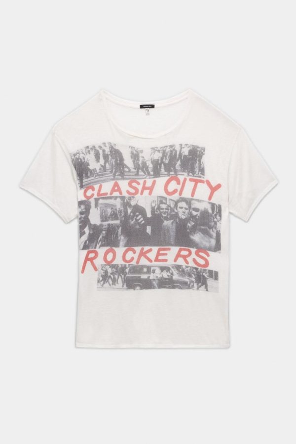 This t-shirt is made of a proprietary knit fabric using the highest quality combed cotton and worsted cashmere yarn from Japan. Both yarns are then knitted in a loose jersey to achieve softness and luxurious appearance that is unmatched. The graphic is a digital print of official Clash artwork.