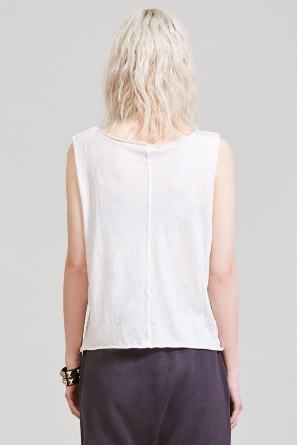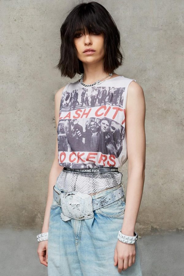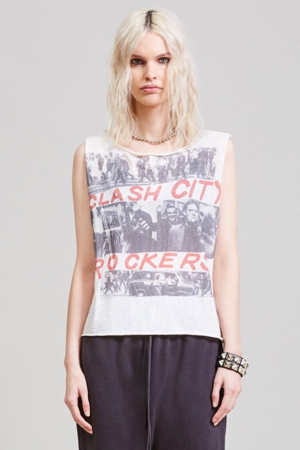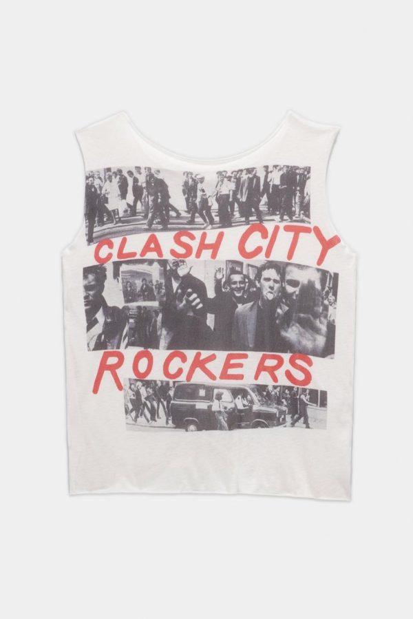 This t-shirt is made of a proprietary knit fabric using the highest quality combed cotton and worsted cashmere yarn from Japan. Both yarns are then knitted in a loose jersey to achieve softness and luxurious appearance that is unmatched. Raw edges throughout the neckline and shoulders for a distressed look. The graphic is a digital print of official Clash artwork.