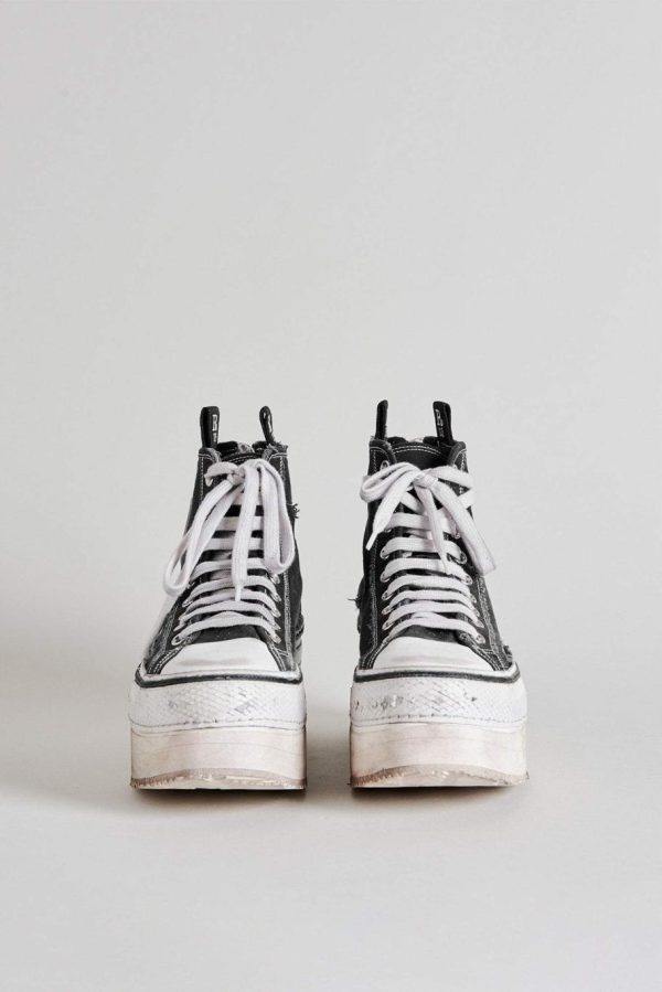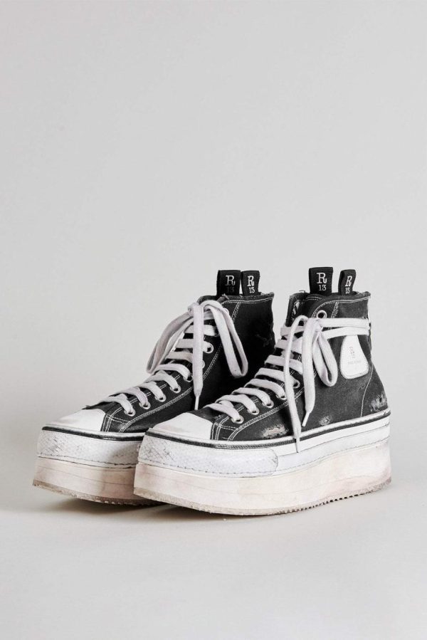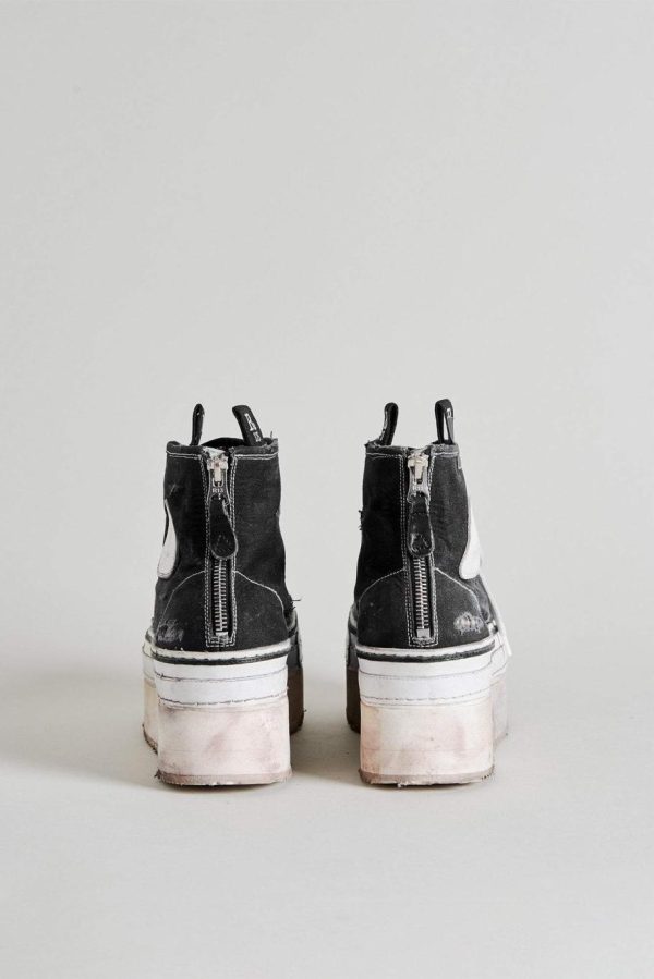Our High-top cotton twill sneaker with hand distressing throughout. Rubber cap in white at round toe. Also features a Lace-up closure in white, R13 embroidered woven pull-loops, zip closure at heel and a hand-stitched textured rubber platform.