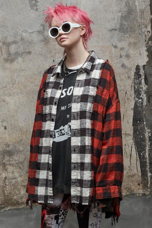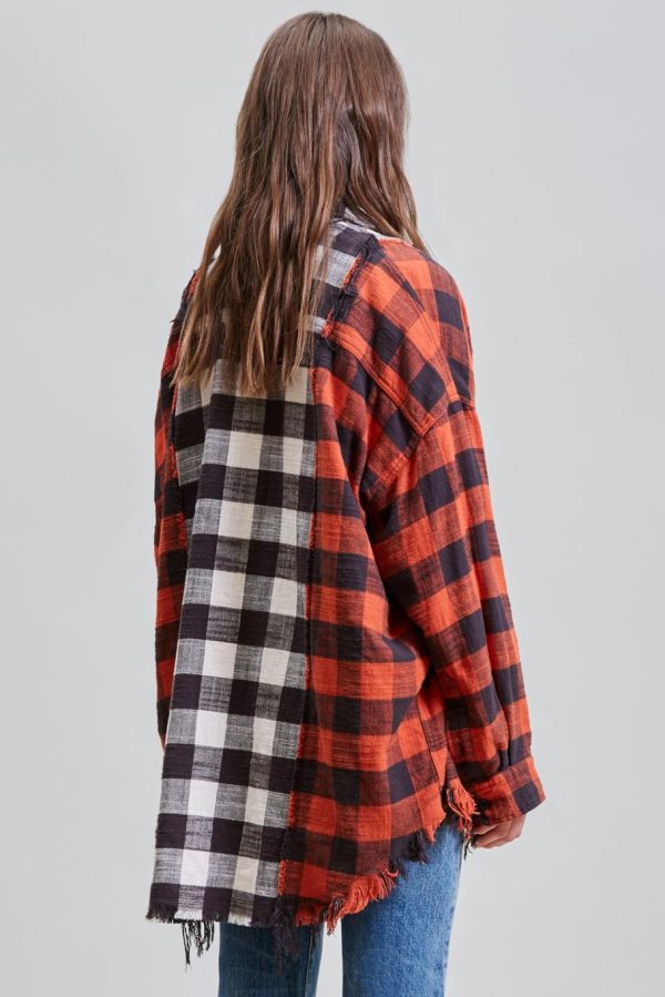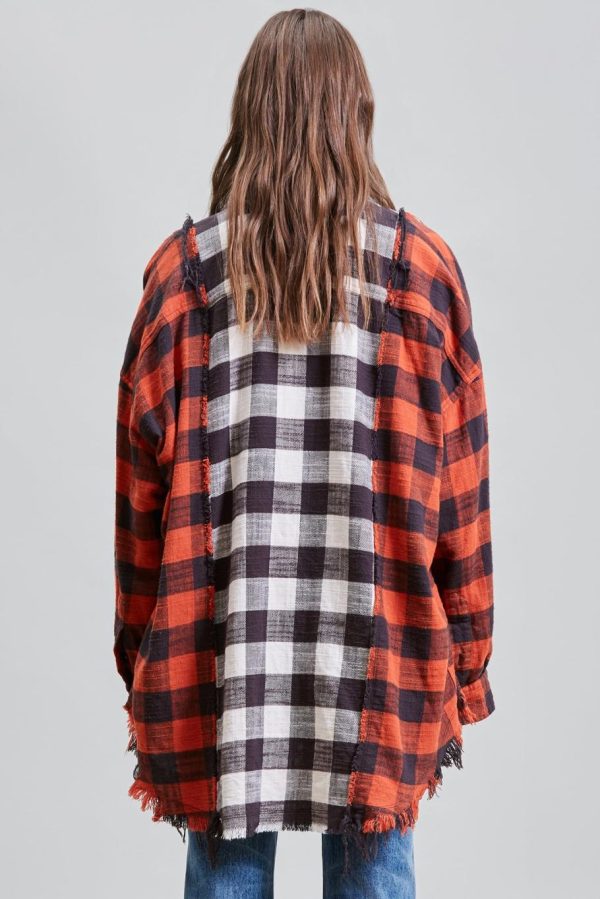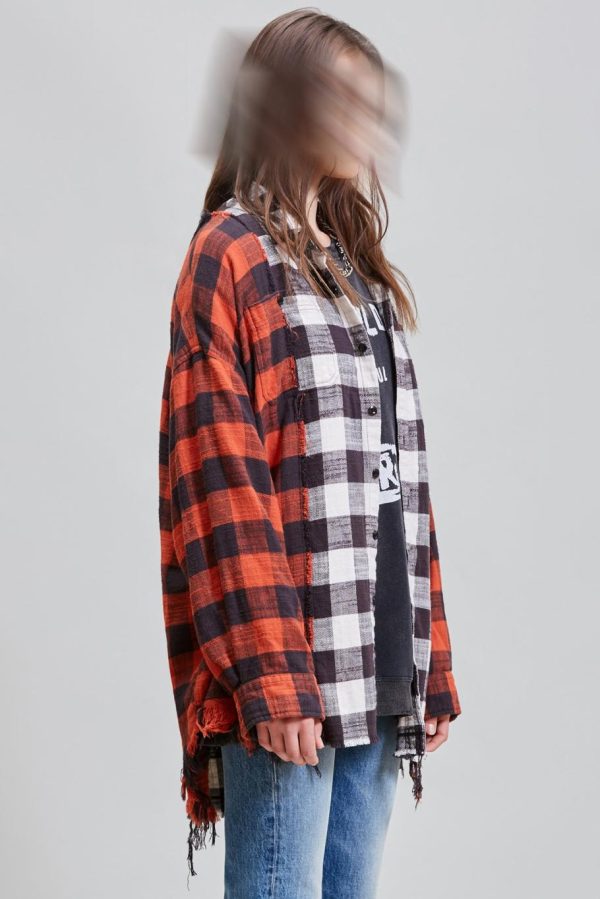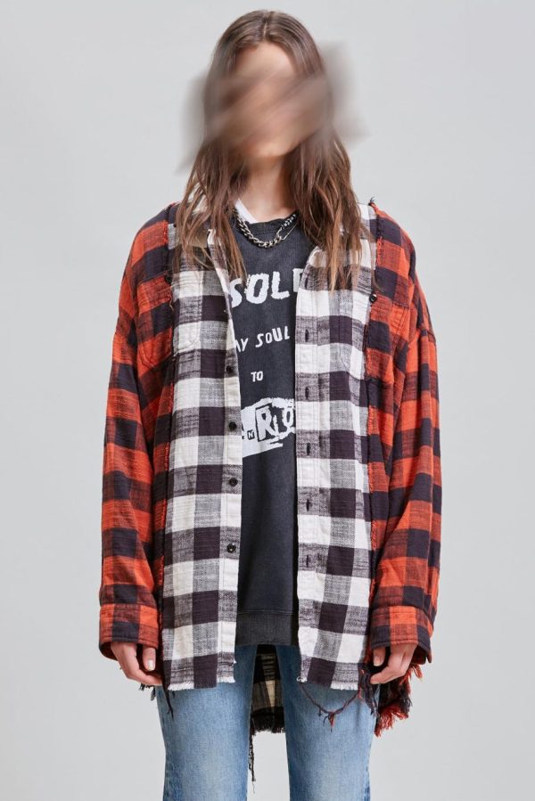 Drop neck combo work shirt made with fine Japanese Cotton in Red and White Buffalo Plaid. Oversized drop neck button down shirt with two toned plaids for deconstructed look. This shirt was stone washed to make garment soft to the touch