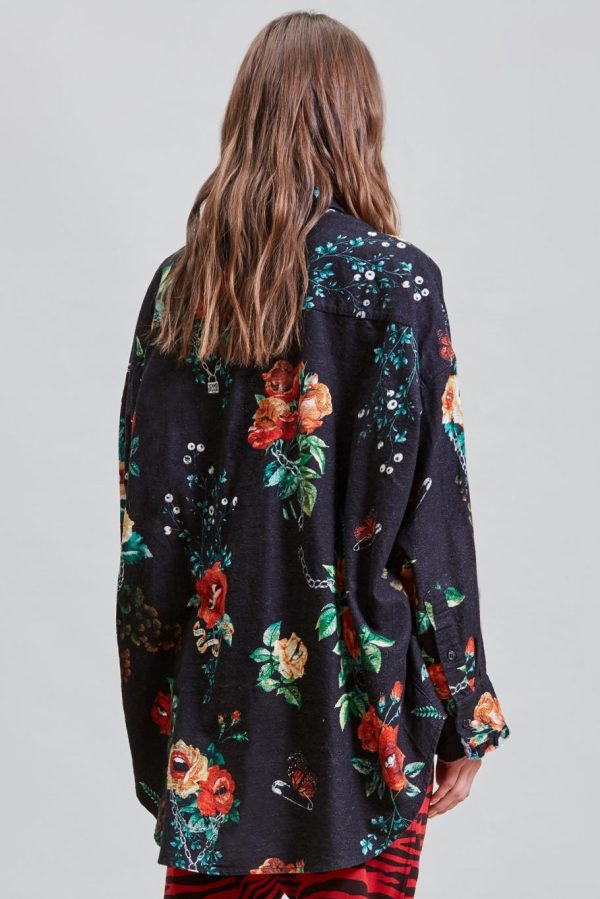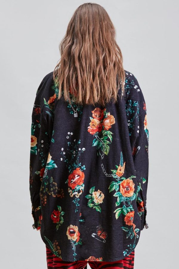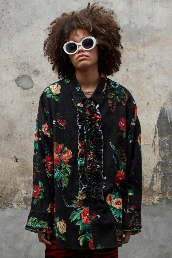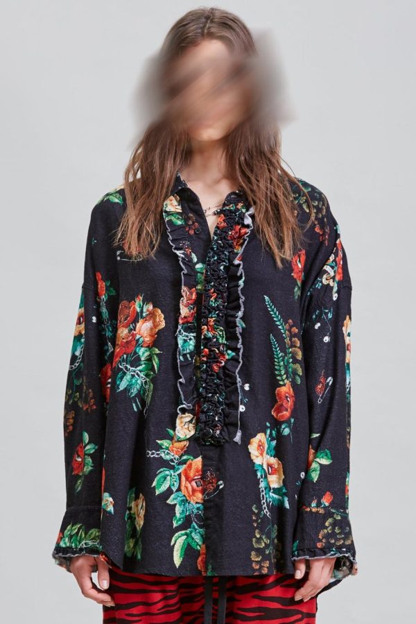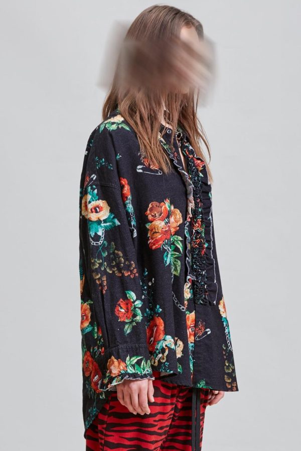 Drop neck Tuxedo shirt made with Cotton in R13 exclusive useless treasures printed cotton flannel. Oversized drop neck button down shirt with fraying edge ruffles for deconstructed look.