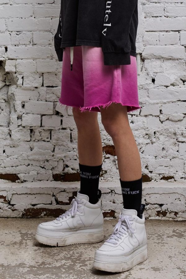 Mid-rise drop crotch Japanese lyocell terry cotton shorts with dray edge hem. Shorts are enzyme stone-washed for softer hand feel and dip-dyed for gradient pink effect.