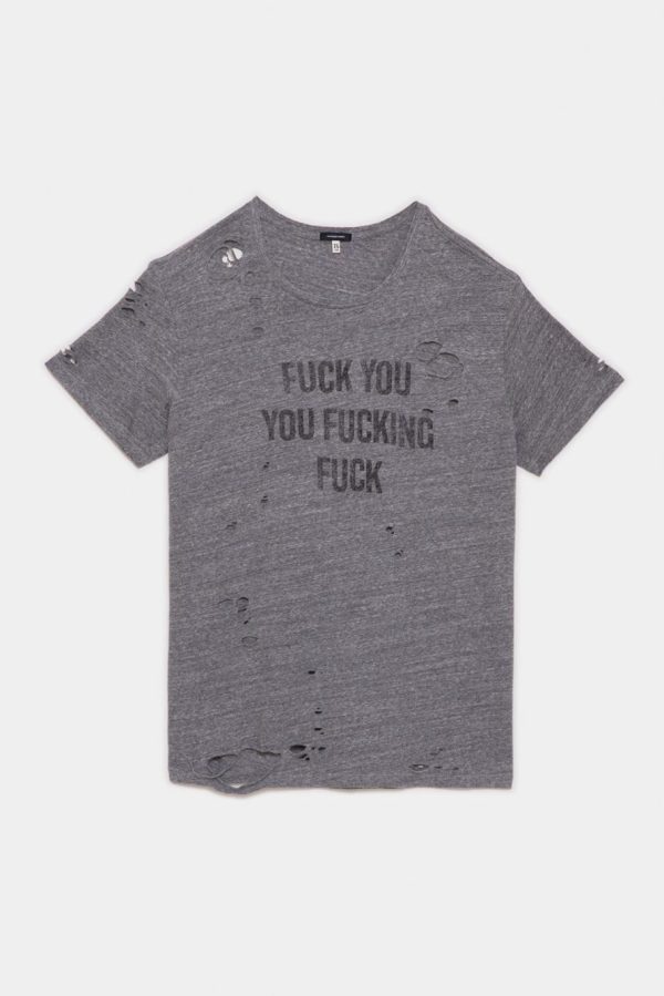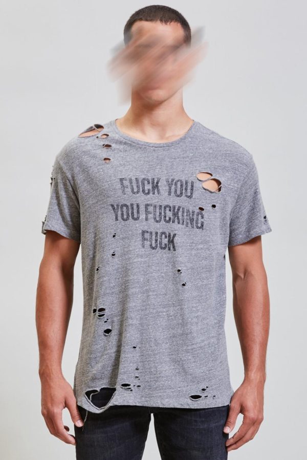 The F.U Ripped Boy t is made of a proprietary knit fabric using Japanese high twist recycled cotton. This shirt was enzyme washed with softener to make garment soft to the touch