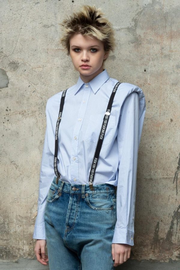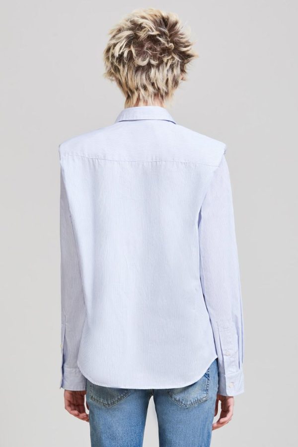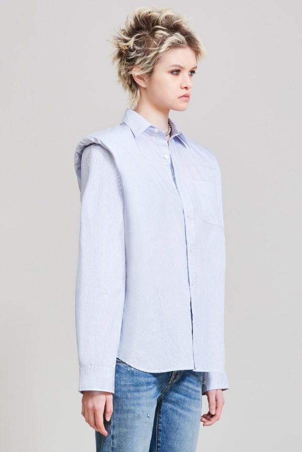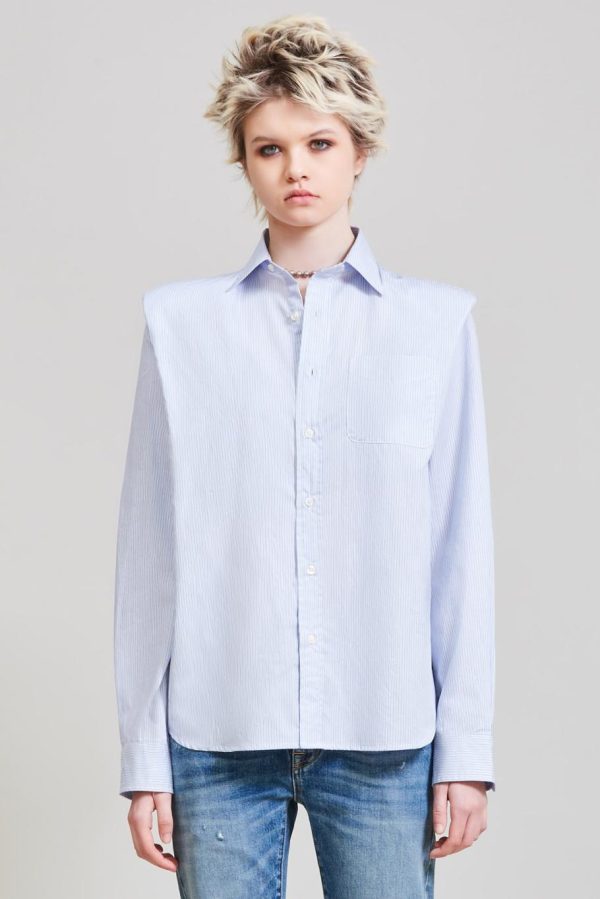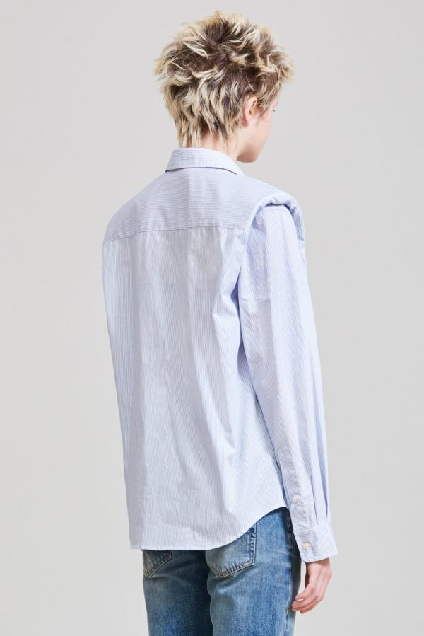 Folded shoulder shirt made with fine cotton poplin. Classic front pocket button down shirt with shoulder pads added for structured look with soft drape at the sides.