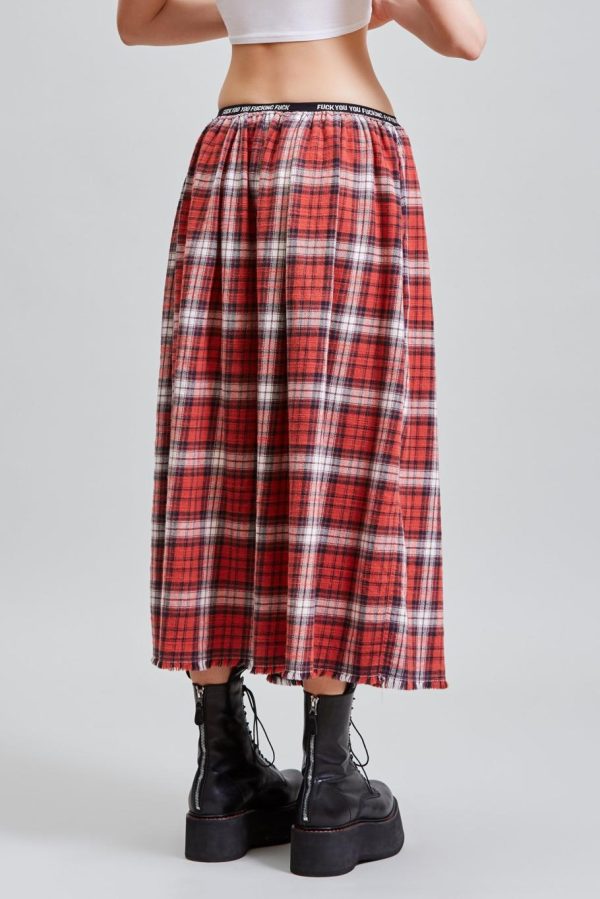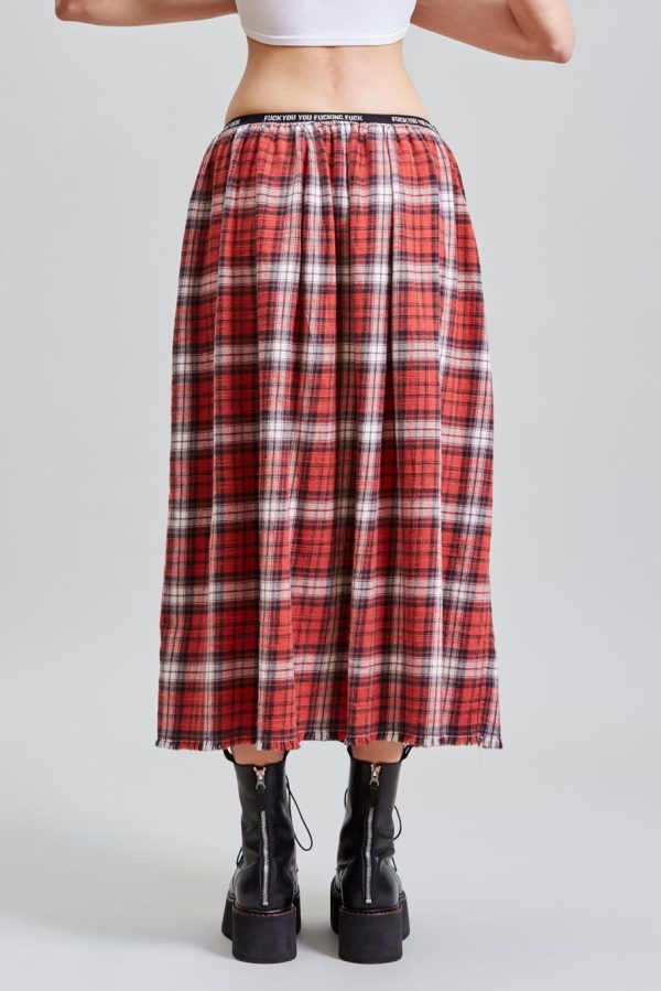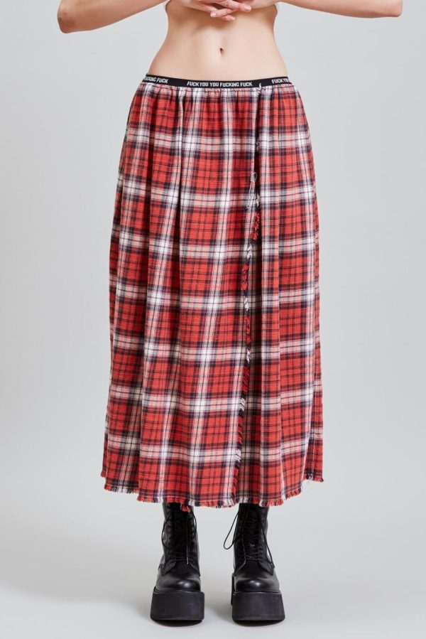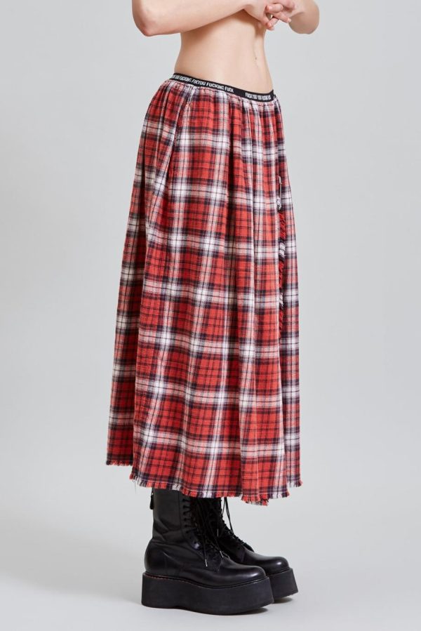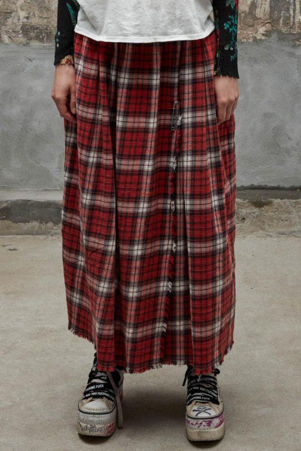 FYYFF Maxi Skirt made with stone washed Japanese flannel. Relaxed silhouette with raw edges, FYYFF elastic waist band and safety pin detail. This skirt has been stone washed to make the garment soft to the touch.