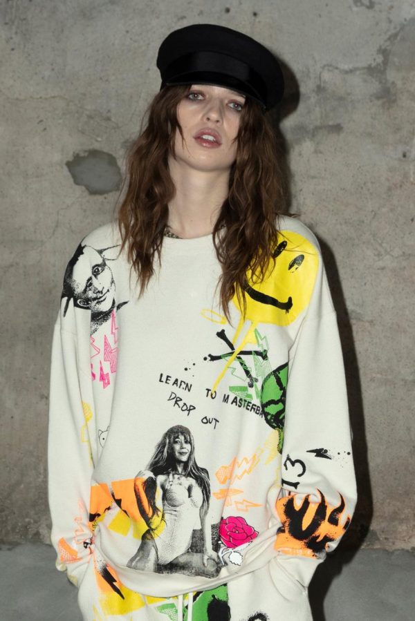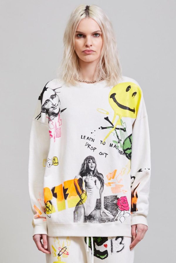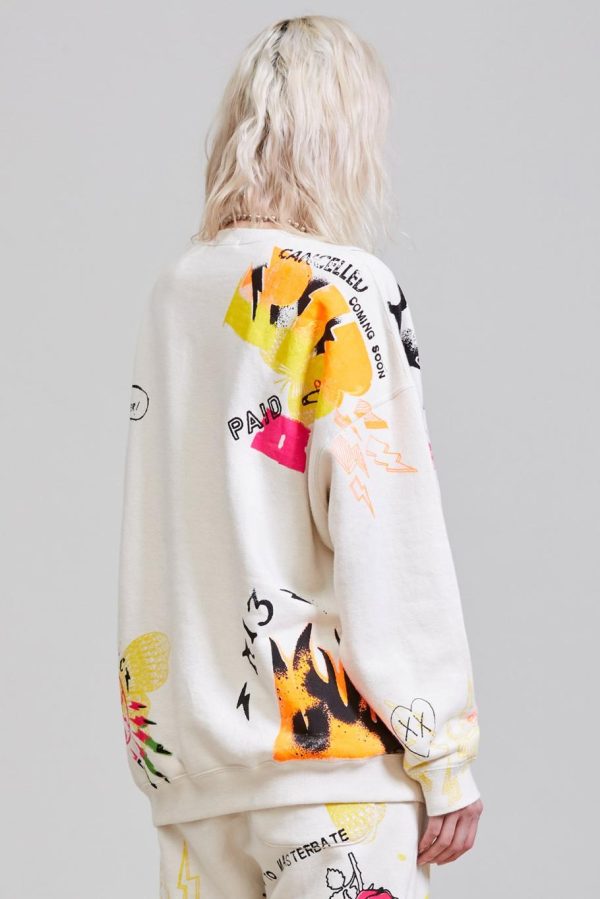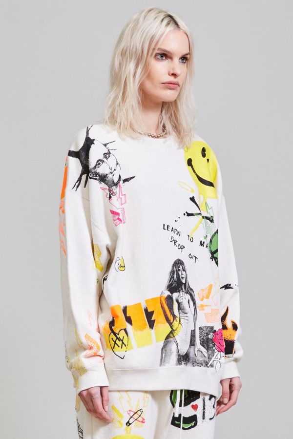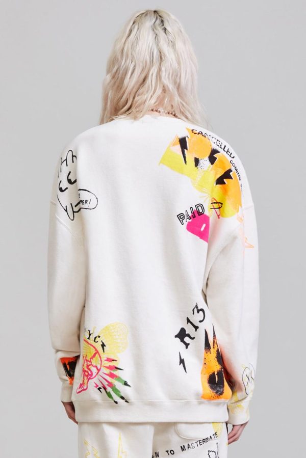 Graffiti oversized crewneck sweatshirt made with brushed back cotton terry. Graffiti made on screen printed stencils with water based ink. This sweatshirt has been washed with softener to make the garment soft to the touch.