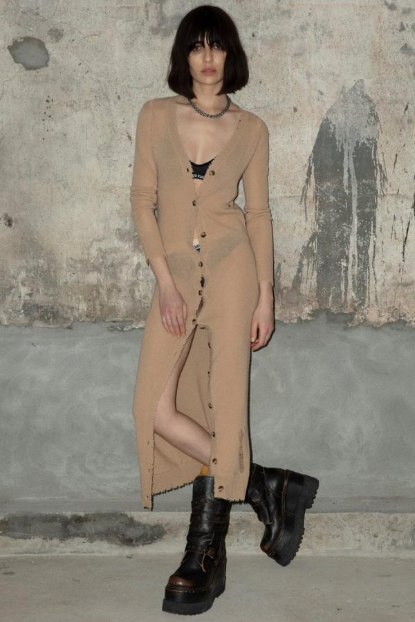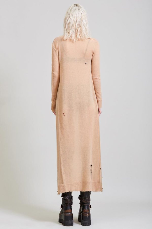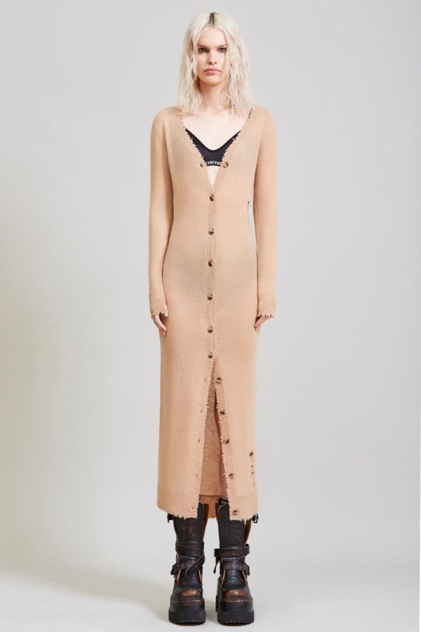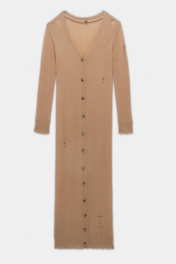 Long skinny cardigan with in Camel. Slim fit with distressed at the cuffs, hem and neckline. Sweater has been washed with Enzyme and Stones to make the garment soft to the touch.