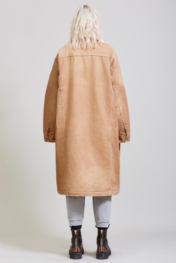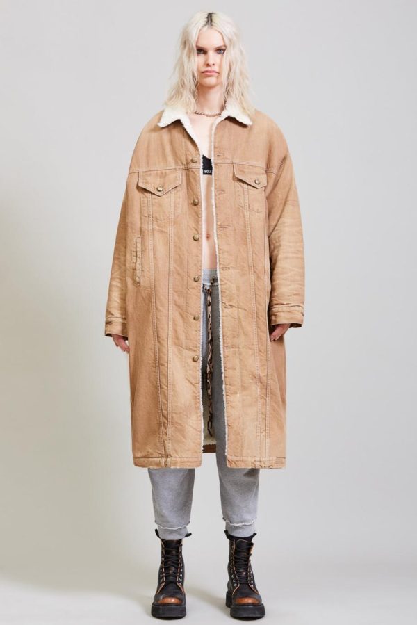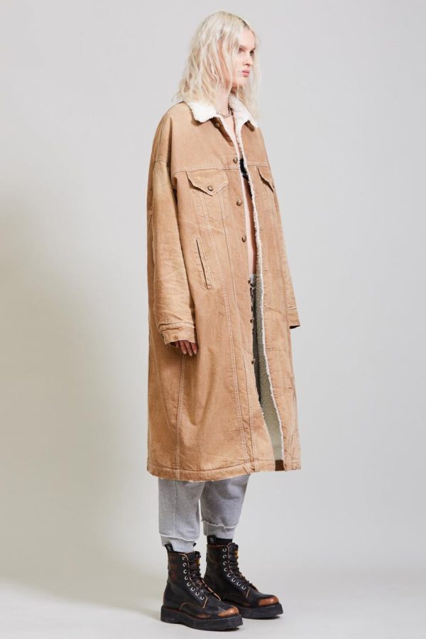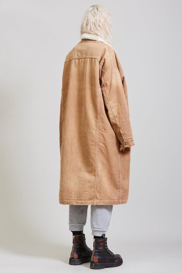 Vintage washed elongated Trucker coat with ecru sherpa collar and lining. Made with broken twill rigid Japanese denim fabric in yarn-dye khaki color.
