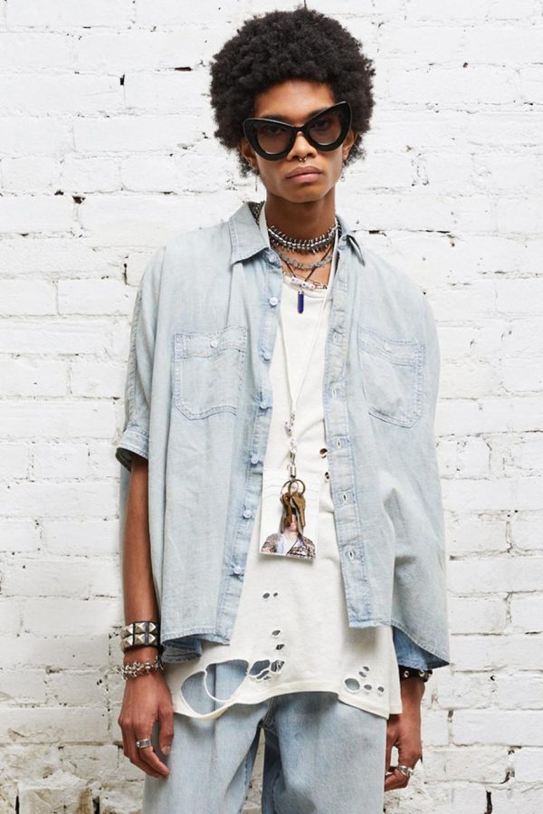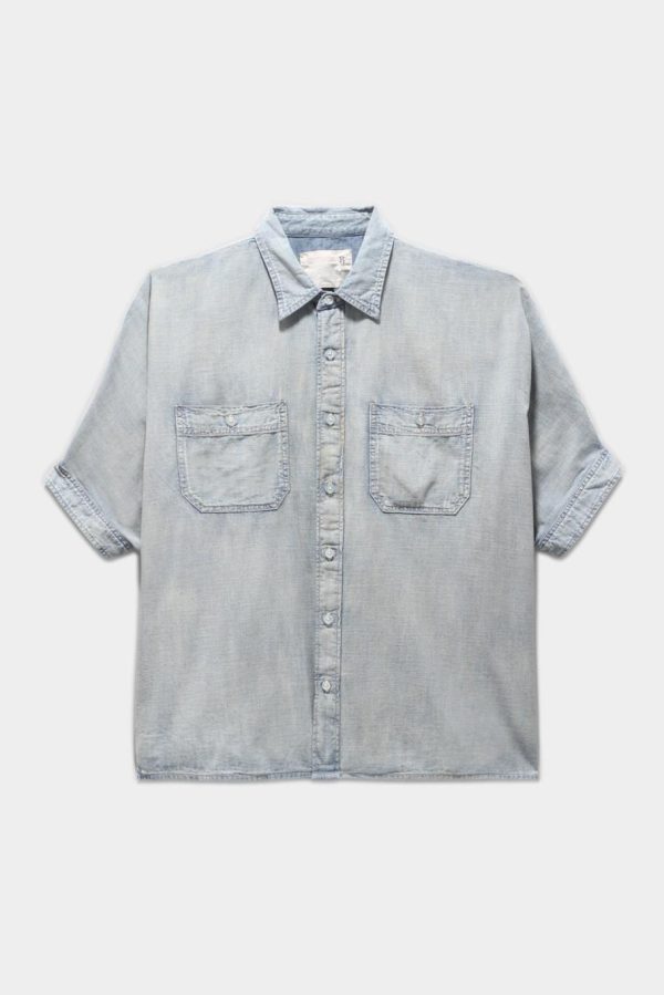 Oversized Boxy Button Up Shirt made from Chambray cotton fabric with light indigo wash. Oversized and Boxy fit with front pockets.