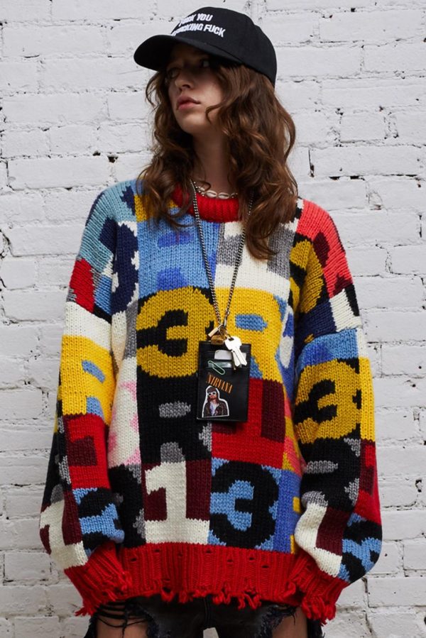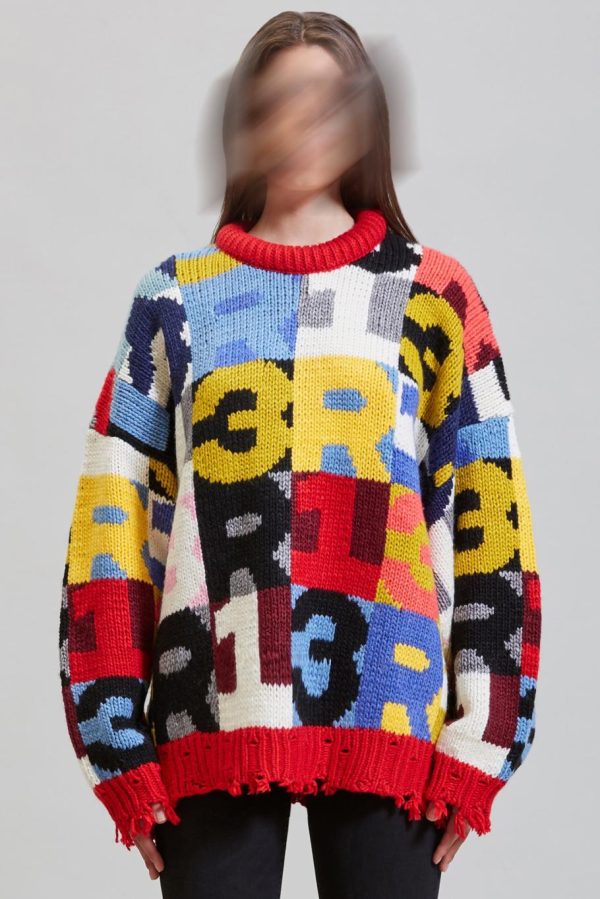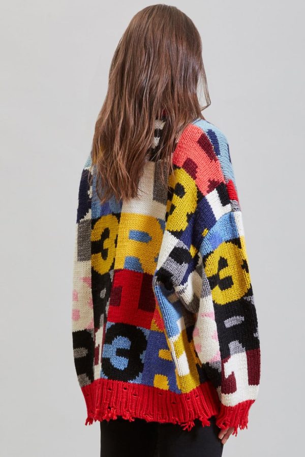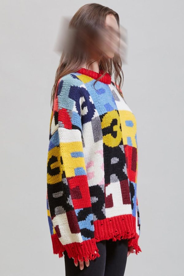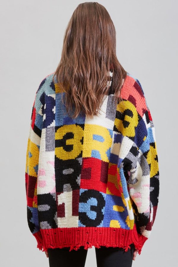 Machine knitted chunky acrylic and wool blend sweater with intarsia R13 lettering and chunky neck detail. Distress at the cuffs, hem, neckline and ribs.