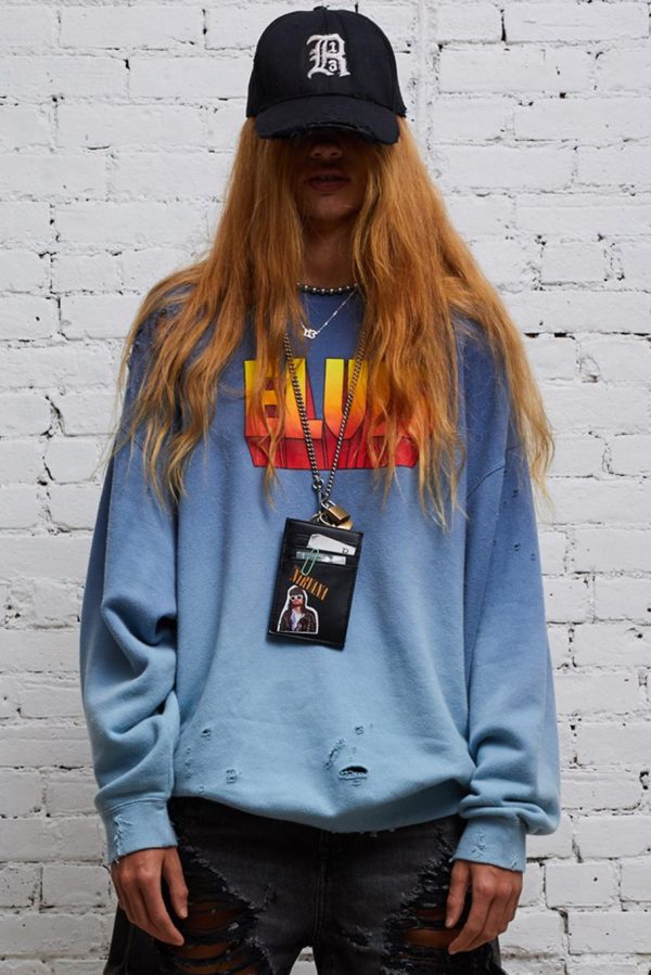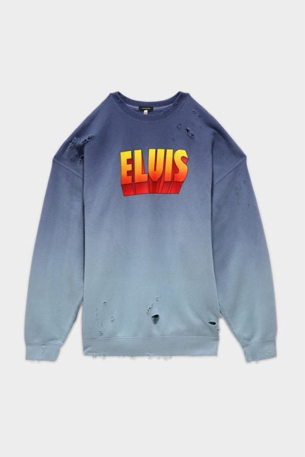 Oversized Elvis Crewneck made from Lyocell enzyme stone-washed Japanese cotton for softer hand feel. Dip-dyed for blue gradient effect and distressed throughout body for deconstructed look.