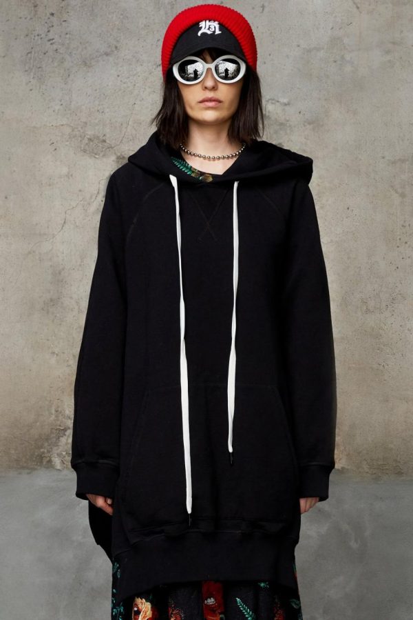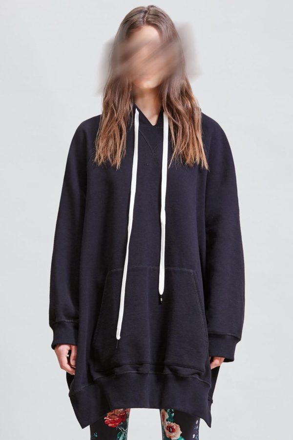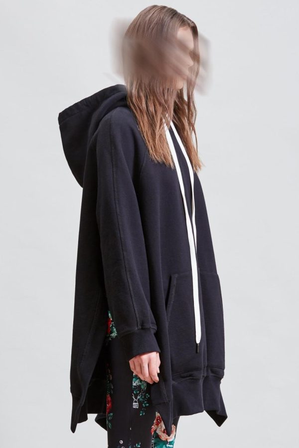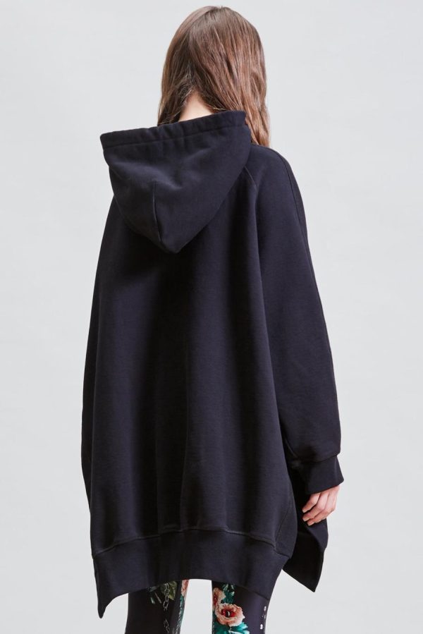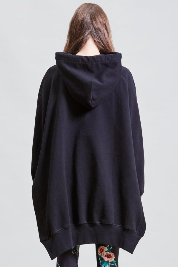 Oversized Hoodie Cape made with Japanese Cotton and Polyester blend in black wash. Oversized fit sweatshirt with wide ecru laces. Sweatshirt has been washed with acid and stones to make the garment soft to the touch.