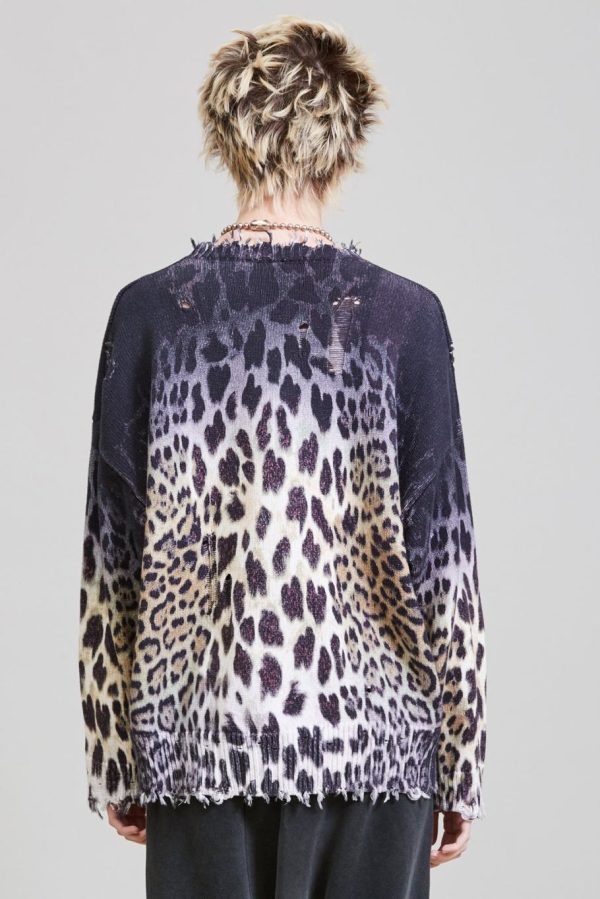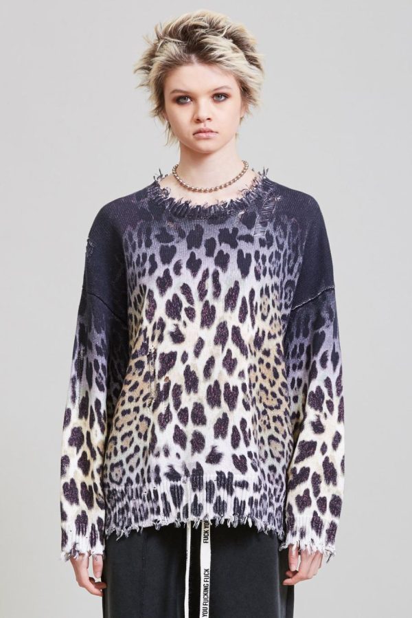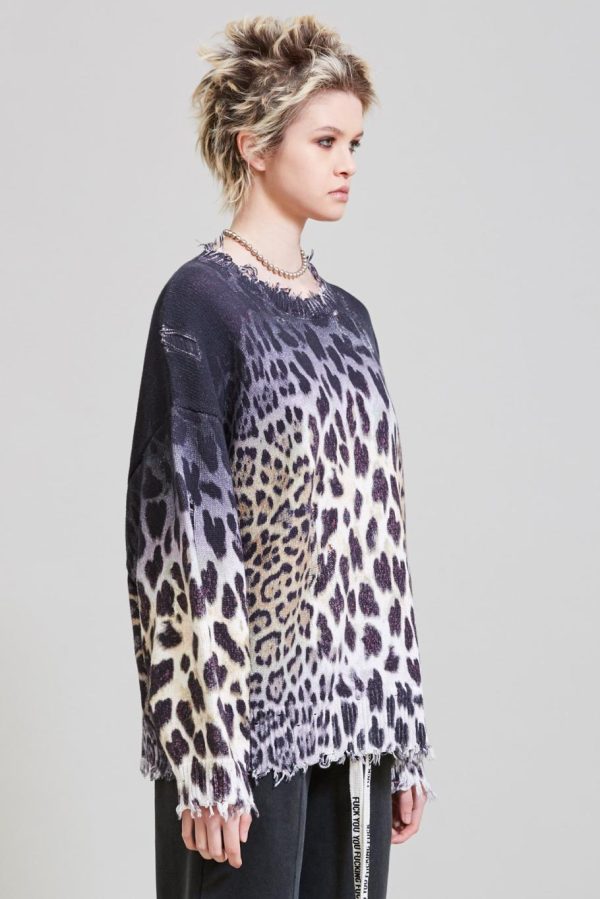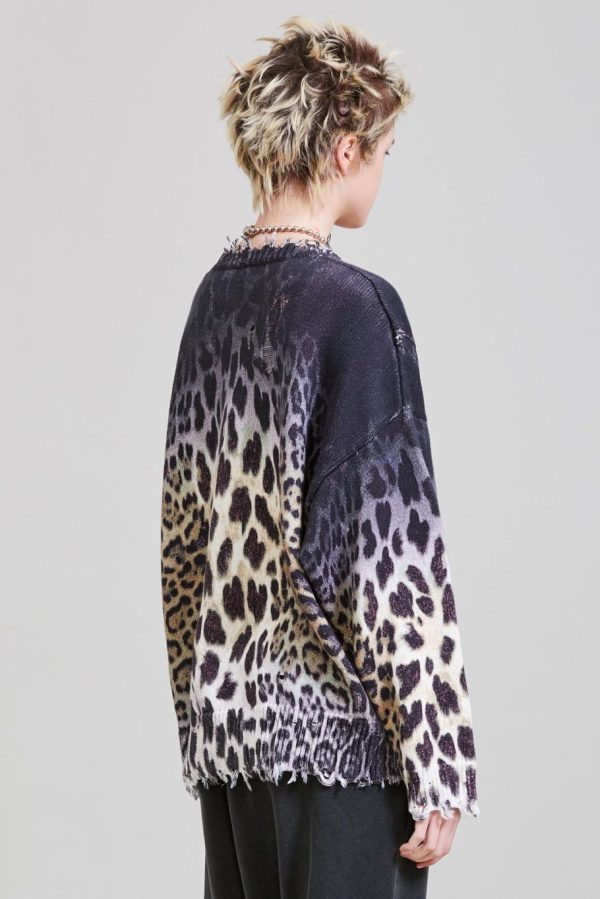 Faded leopard oversized sweater with all over digital ombre leopard print made of cotton yarn. Distressed at the cuffs, hem and neckline. Sweater has been washed with Enzyme and Stones to make the garment soft to the touch.