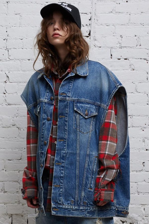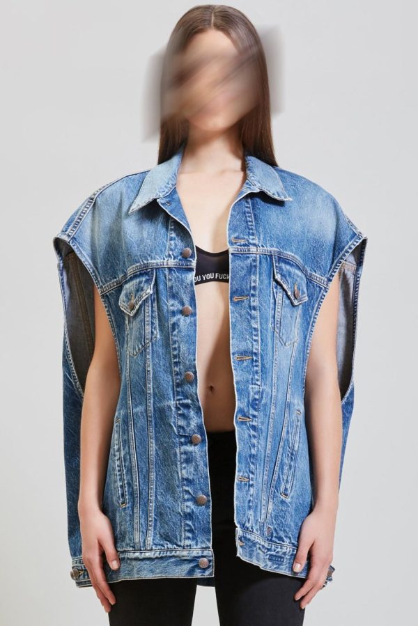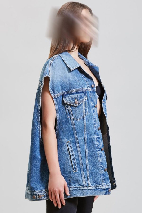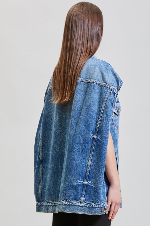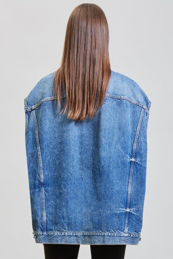 Oversized Trucker Vest made with Italian rigid denim. Vest has Medium Blue Vintage Wash for vintage look.