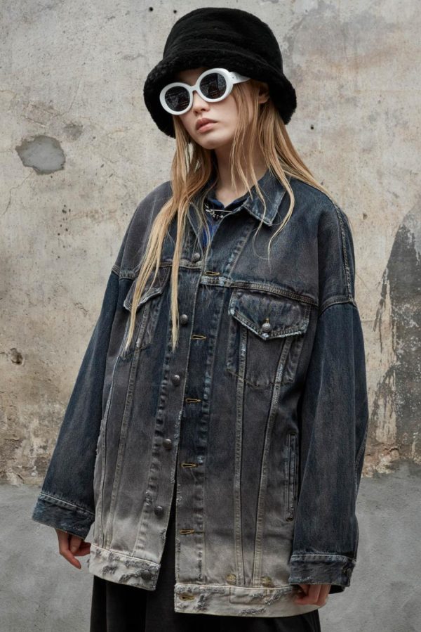 Oversized drop shoulder trucker jacket made with black and indigo denim. Bleached, then overdyed with dark gray dye. Fading effect at the waist hem.