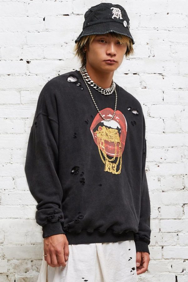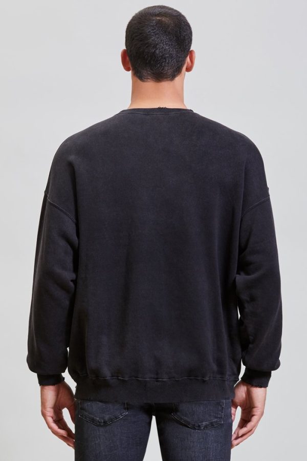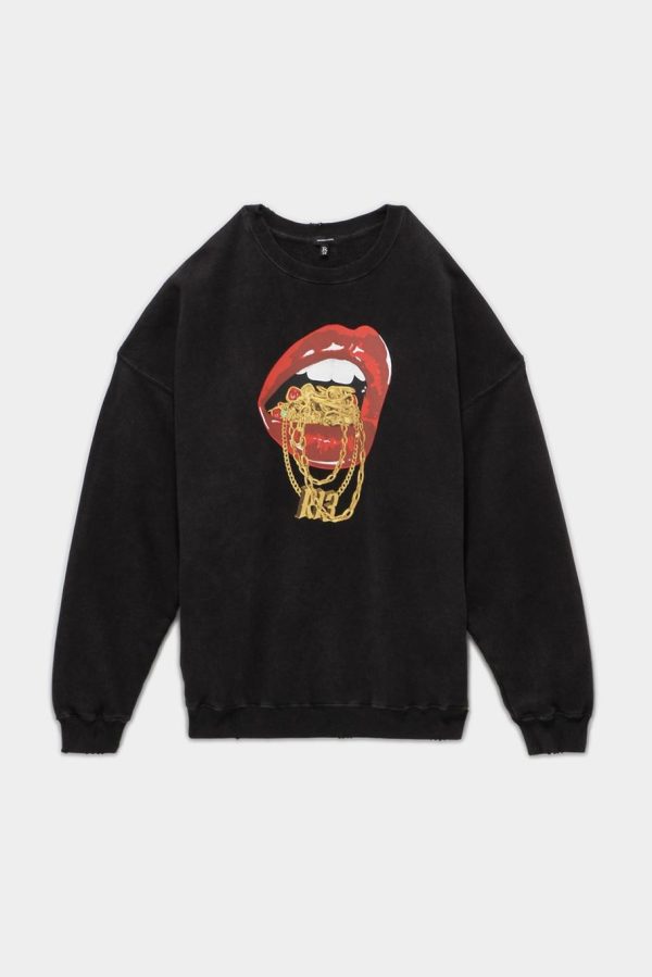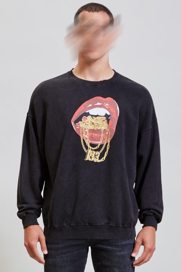 R13 Bling Oversized Crewneck made from Lyocell enzyme stone-washed Japanese Cotton for softer hand feel. Full distressing throughout sweatshirt for deconstructed look. Screen-printed graphic designed by Useless Treasures for R13