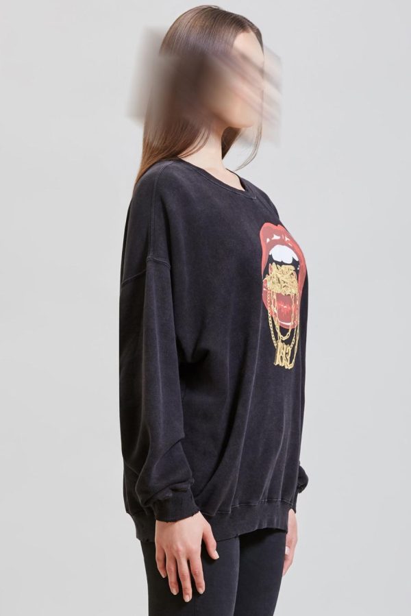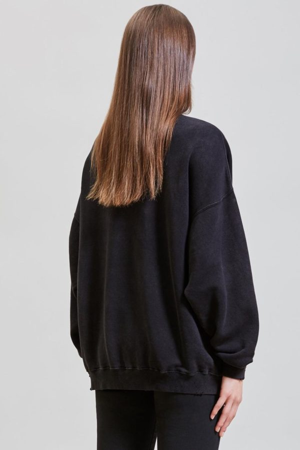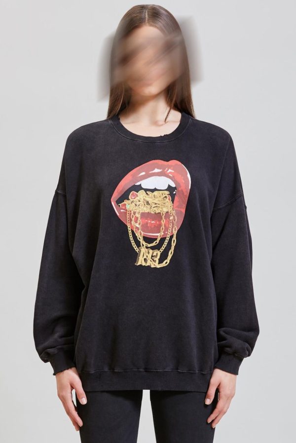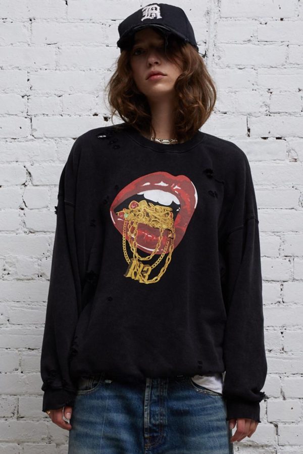 R13 Bling Oversized Crewneck made from Lyocell enzyme stone-washed Japanese Cotton for softer hand feel. Full distressing throughout sweatshirt for deconstructed look. Screen-printed graphic designed by Useless Treasures for R13