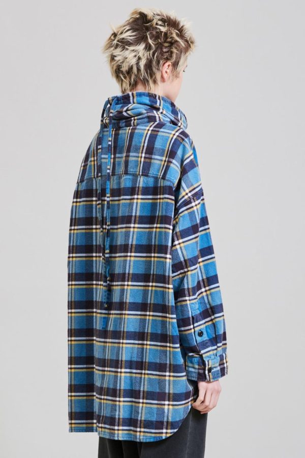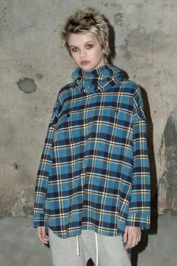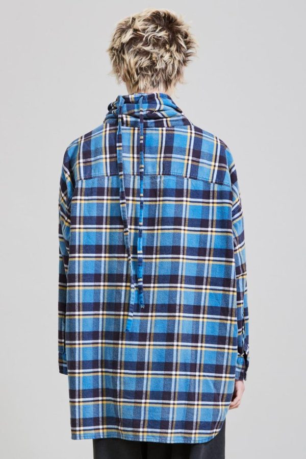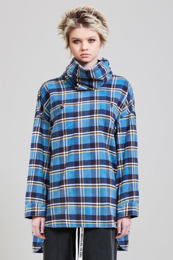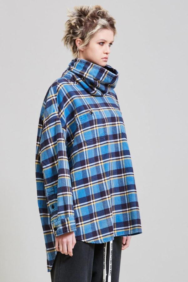 R13 Maskup Flannel Workshirt made with blue cotton plaid. Exaggerated turtleneck with drawstring. Can be used to cover your mouth and serve as a mask*. This shirt was enzyme washed for soft worn-in feel.
