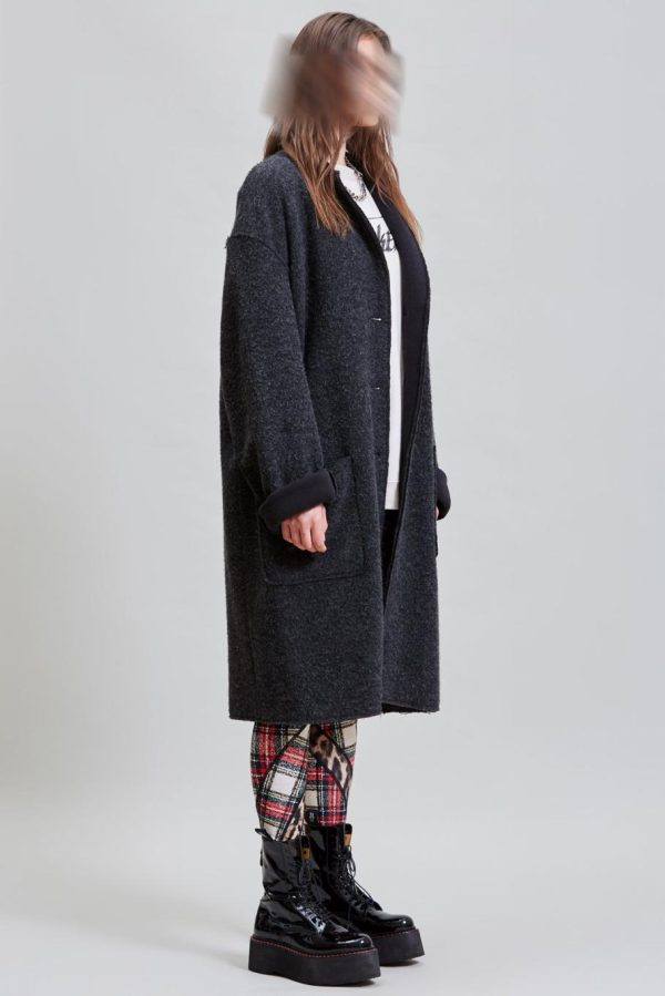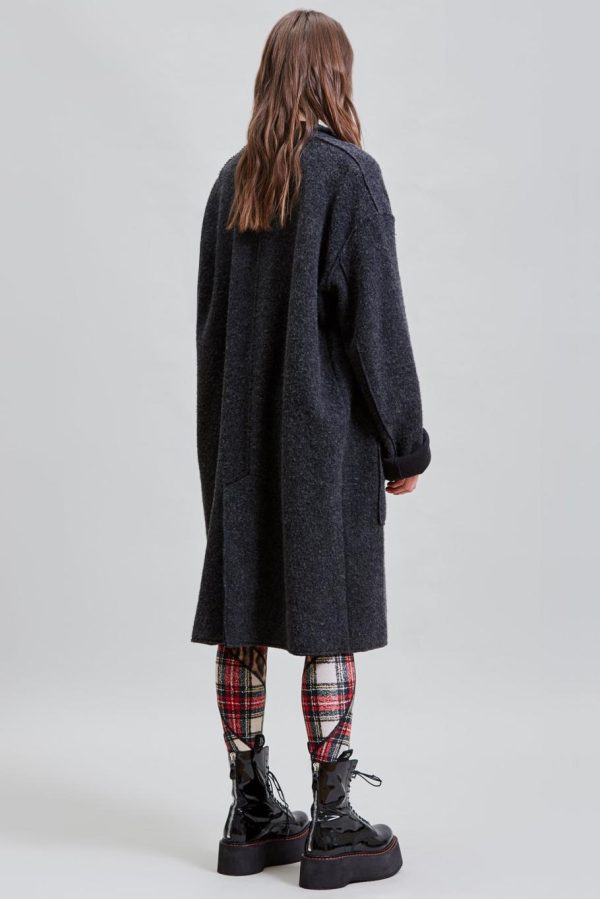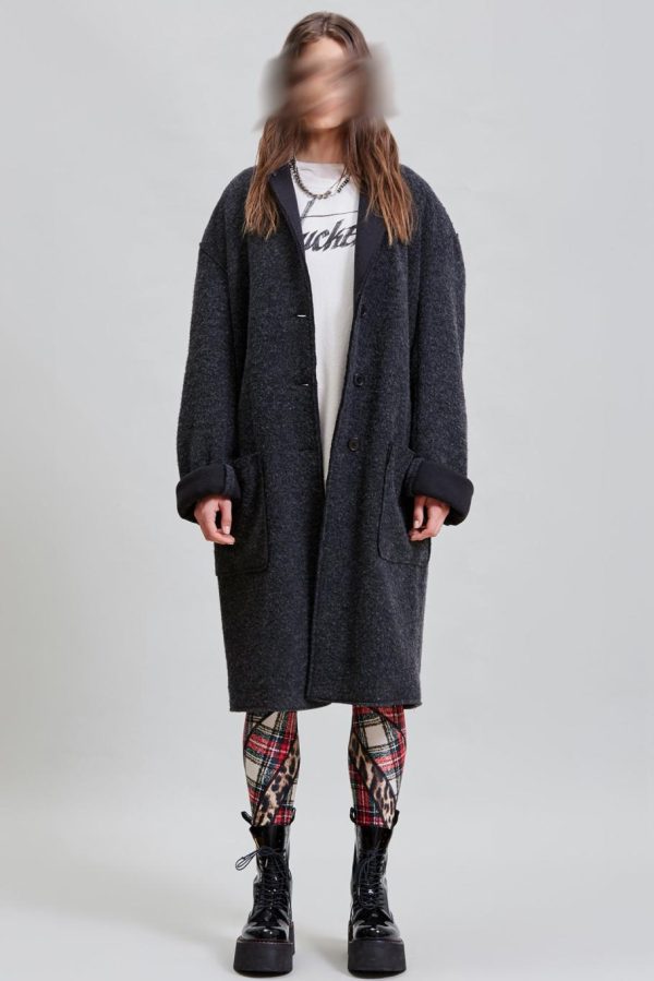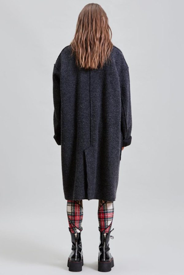 Raw Cut Coat made with Japanese brushed terry with smooth inside backing.Oversized silhouette with contrast details at top collar and lapel. Raw seam details throughout all seams of the coat.