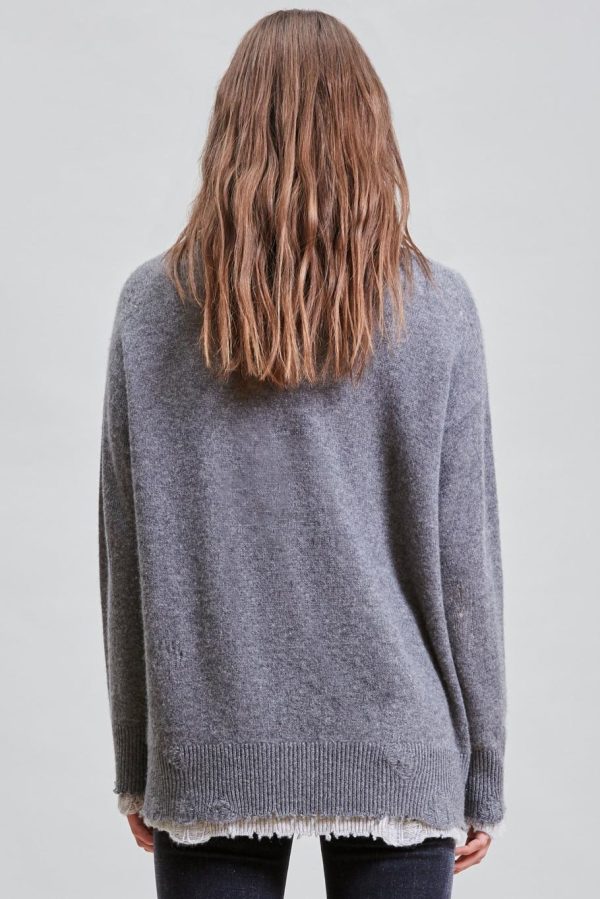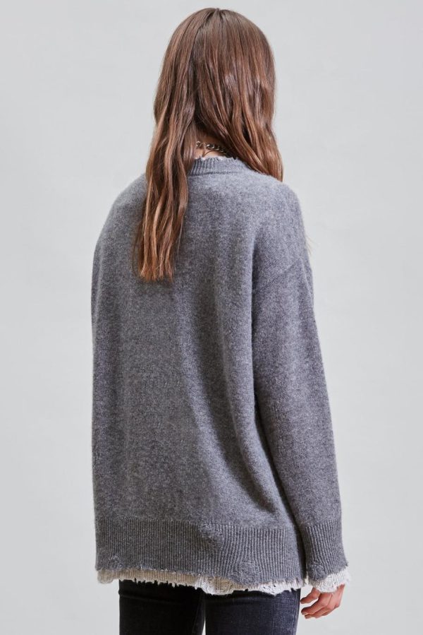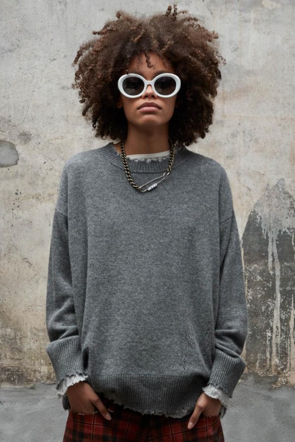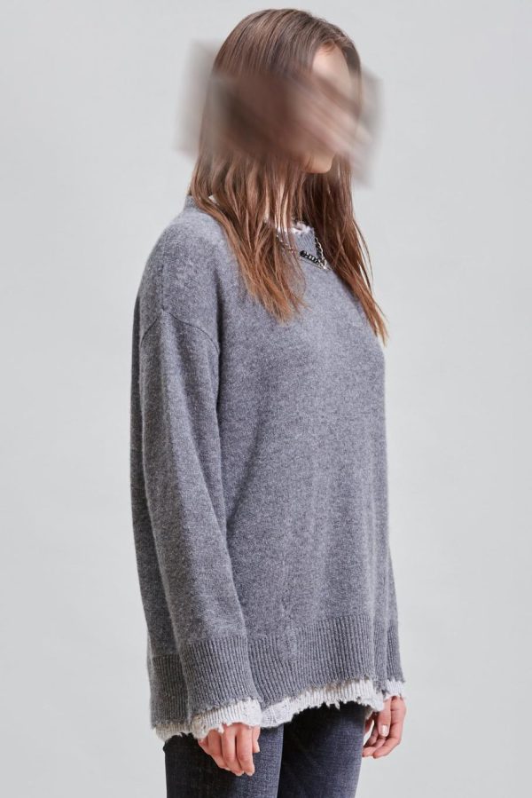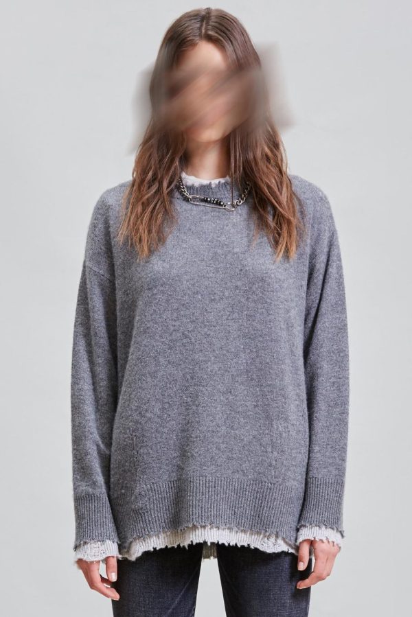 Knitted sweater double layered made of cashmere yarn. Distressed at the cuffs, hem and neckline. Sweater has been washed with Enzyme and Stones to make the garment soft to the touch.
