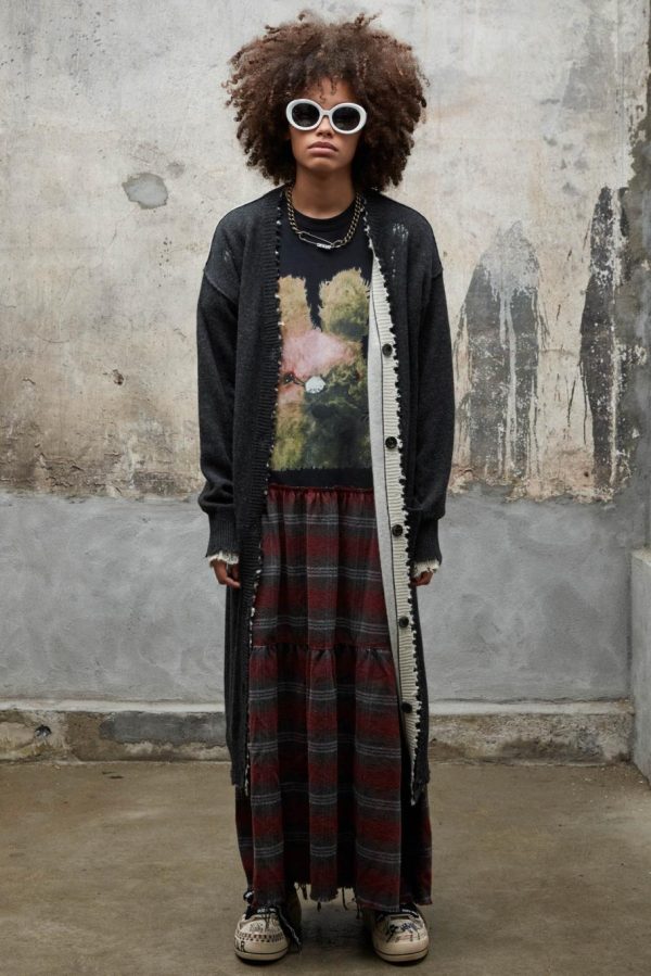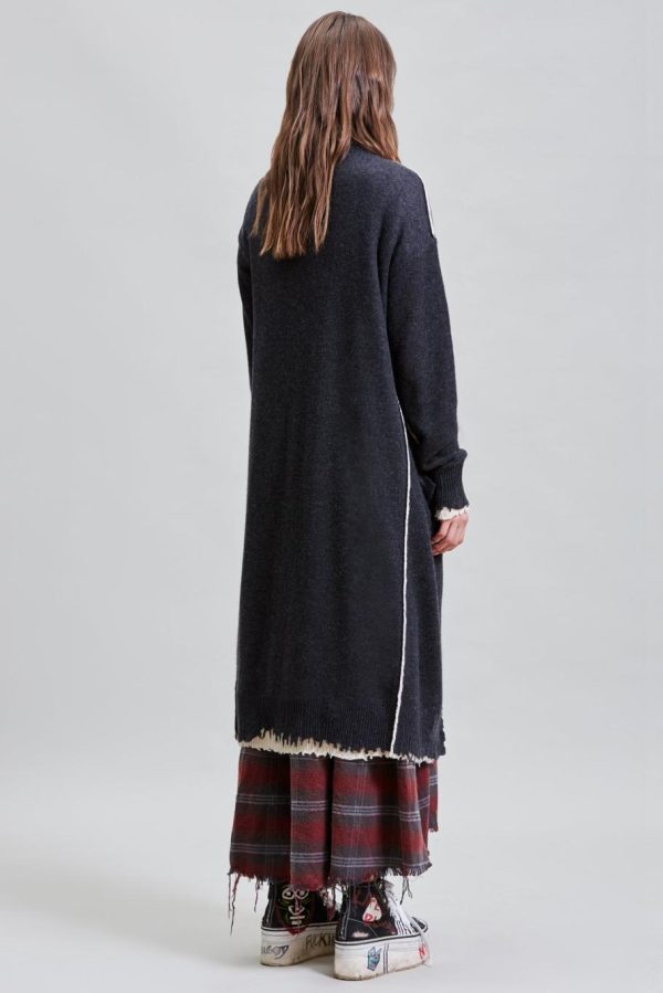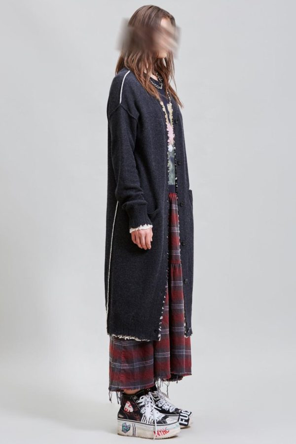Knitted cardigan double layered made of cashmere yarn. Distressed at the cuffs, hem and neckline. Sweater has been washed with Enzyme and Stones to make the garment soft to the touch.