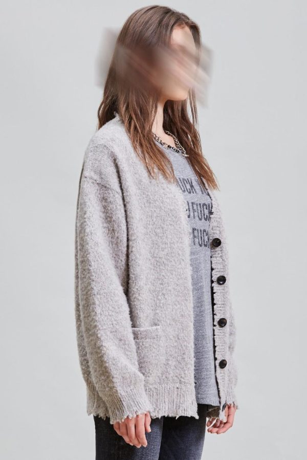 Shaggy Distressed Edge Cardigan made of brushed merino wool. Distressed at the cuffs, hem, pockets and neckline. Sweater has been washed with Enzyme and Stones to make the garment soft to the touch.