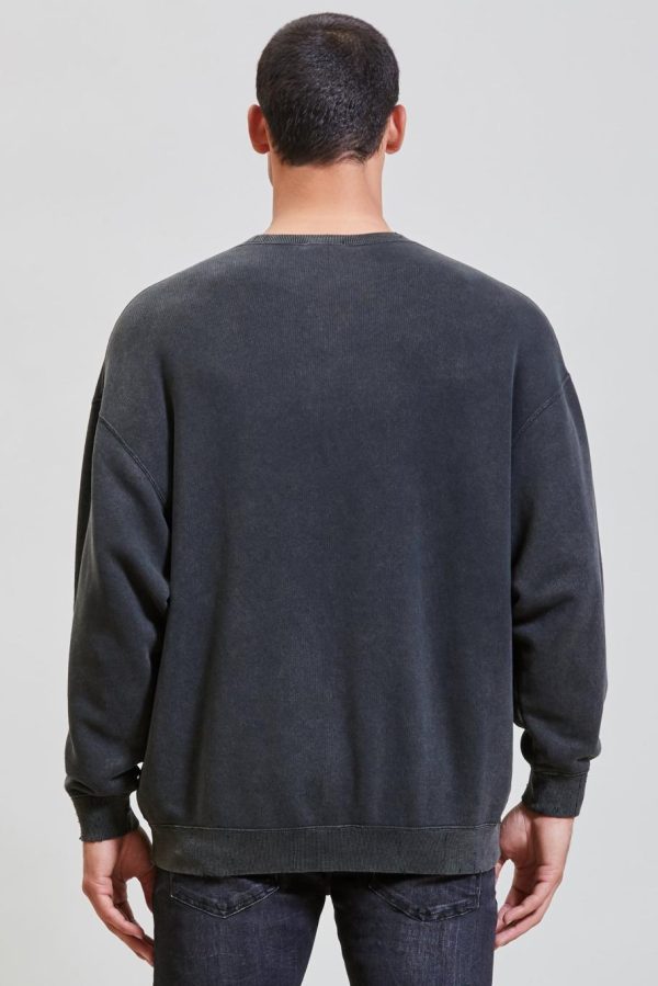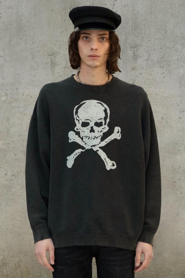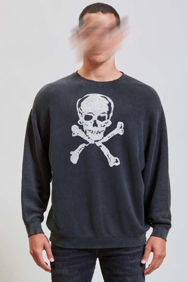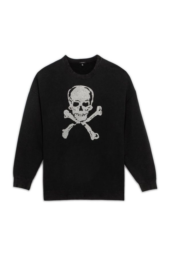Skull oversized crewneck sweatshirt made with Japanese cotton lyocell terry in an acid black wash. Oversized fit sweatshirt with light distressing at ribs. Screen printed with discharge base. Sweatshirt has been washed with Enzyme and Stones to make the garment soft to the touch.