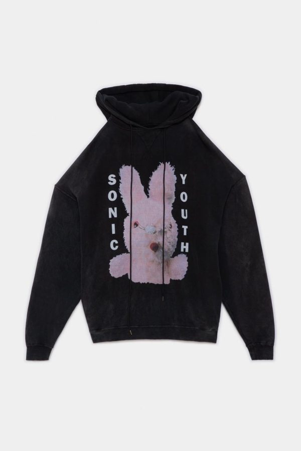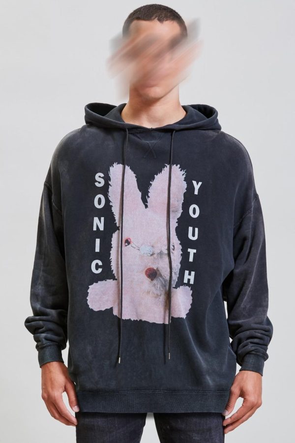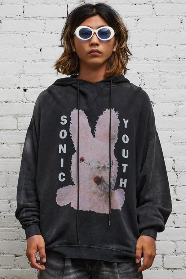 Sonic Youth Bunny Oversized Sweatshirt made with Japanese cotton lyocell terry in an acid black wash. Oversized fit screen printed sweatshirt. Sweatshirt has been washed with acid and stones to make the garment soft to the touch.