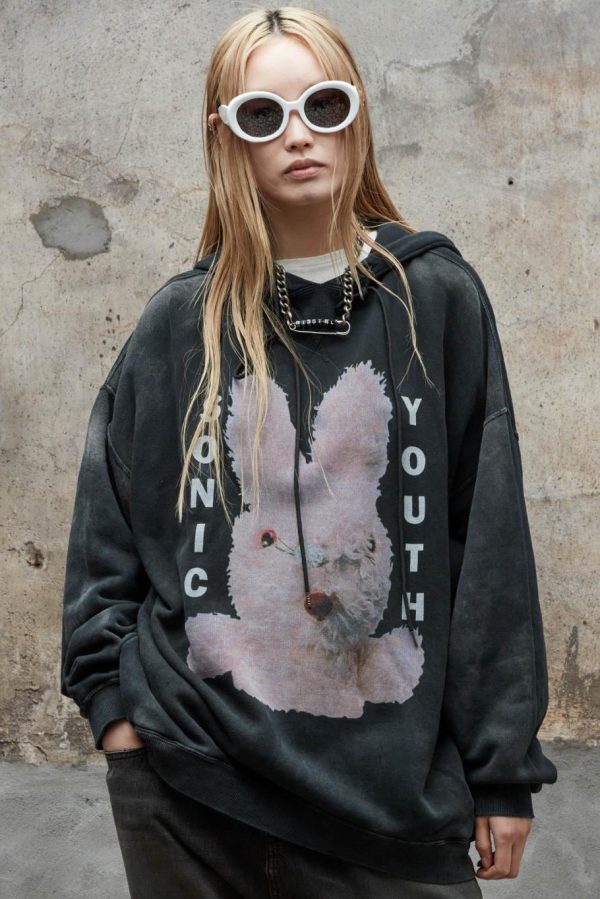 Sonic Youth Bunny Oversized Sweatshirt made with Japanese cotton lyocell terry in an acid black wash. Oversized fit screen printed sweatshirt. Sweatshirt has been washed with acid and stones to make the garment soft to the touch.
