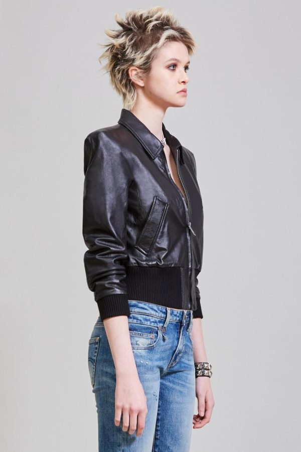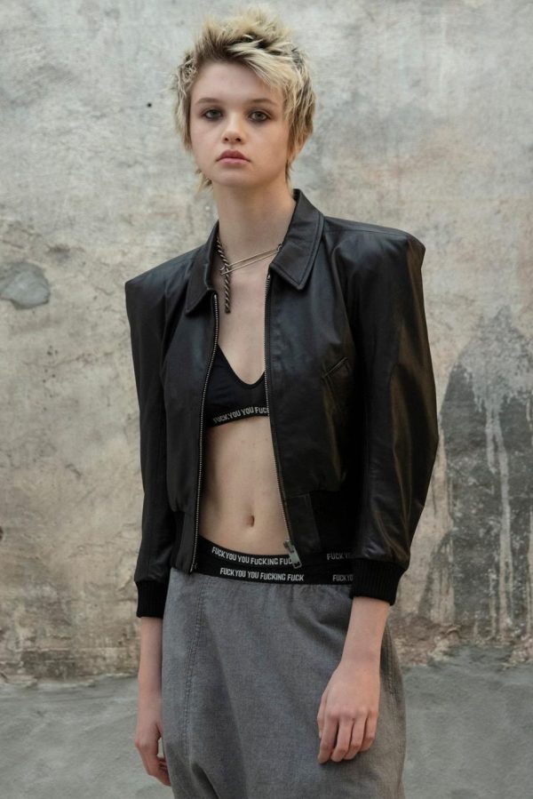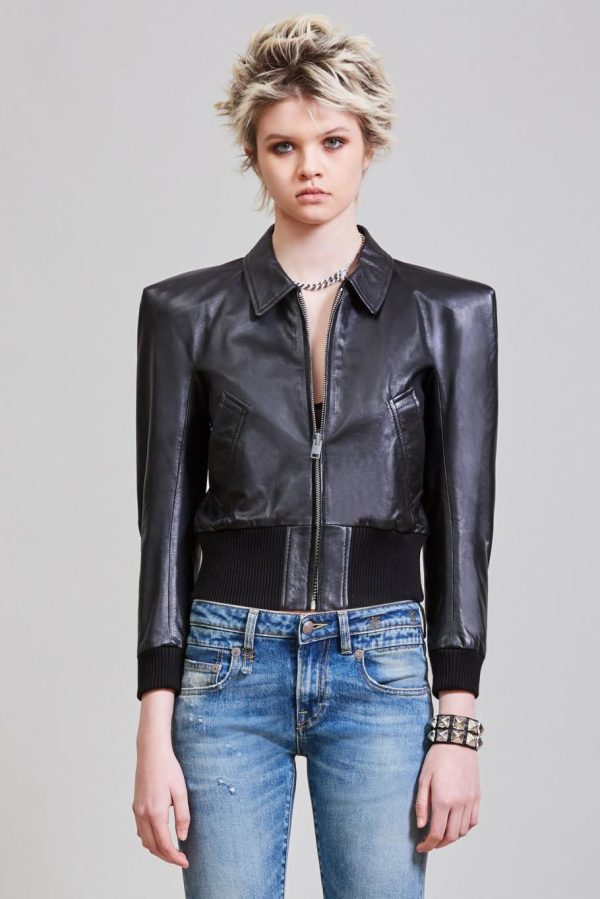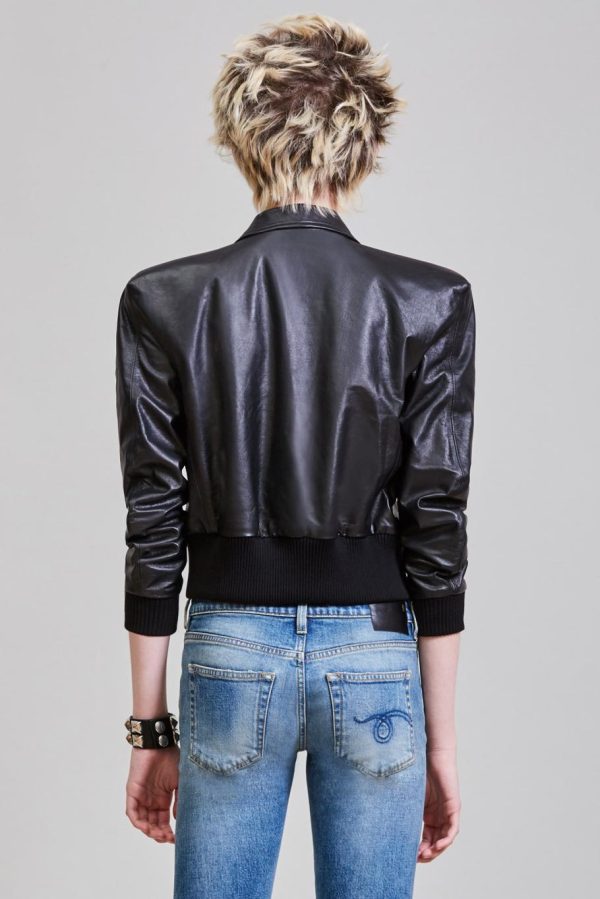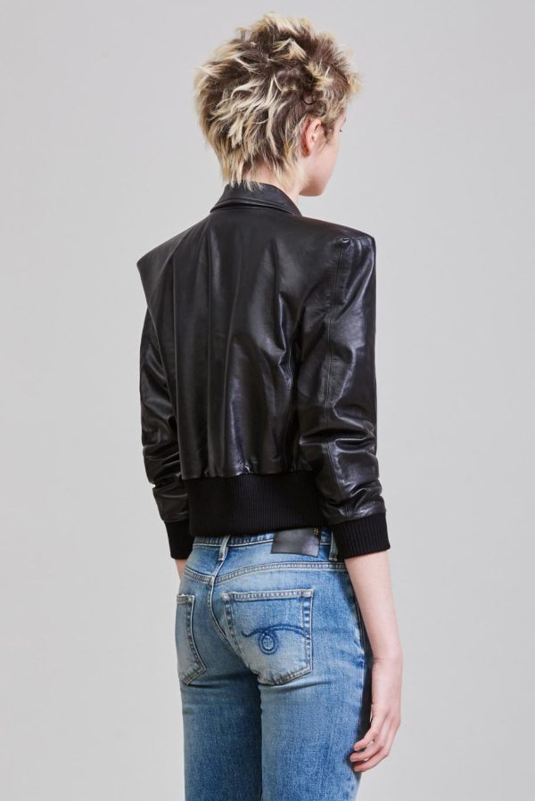 Bomber jacket in soft nappa leather with strong shoulders and ribbed at cuffs and hems. Shrunken fit jacket with exaggerated square shoulder pads and cupra twill lining.