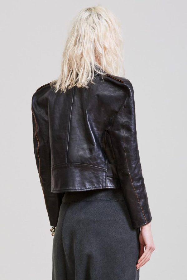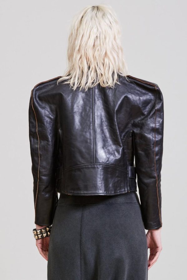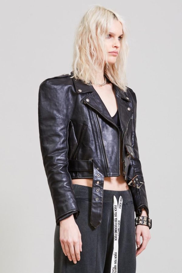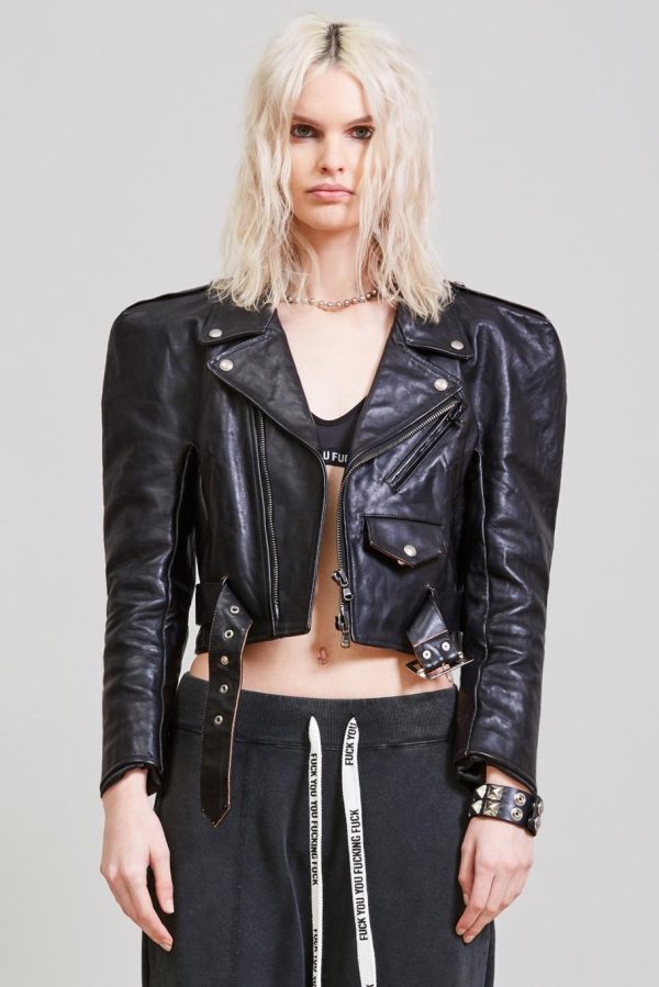 Square shoulder crop moto jacket made with Italian cow leather and cupra twill lining. Shrunken fit jacket with square constructed shoulders and classic motorcycle details.