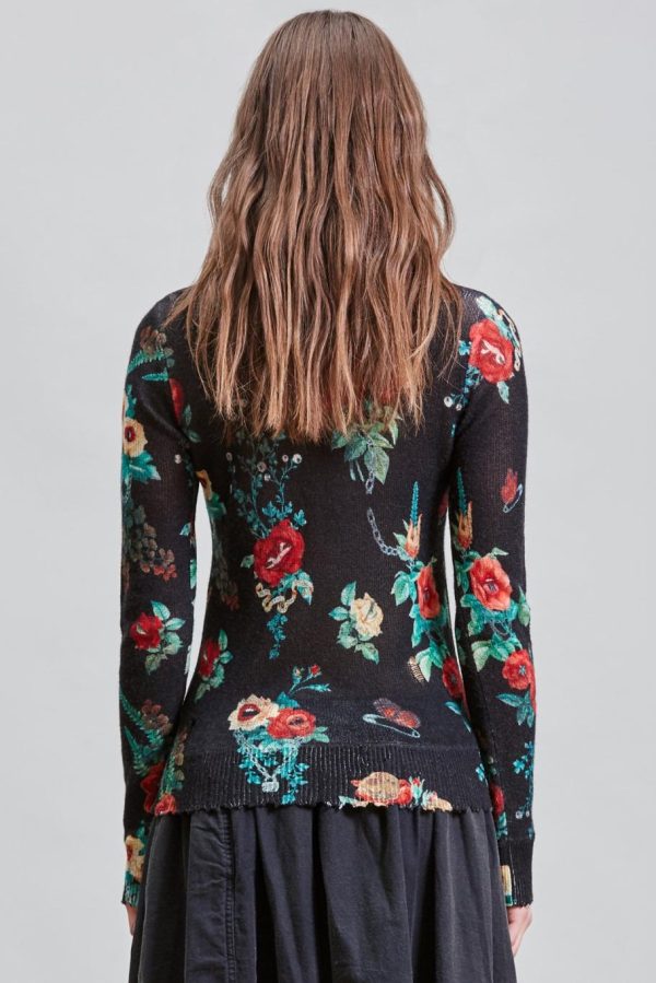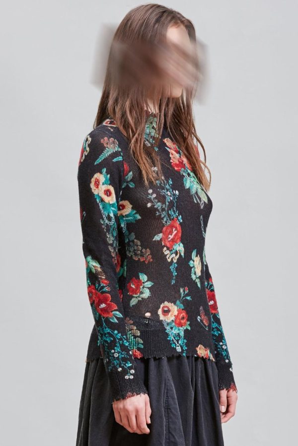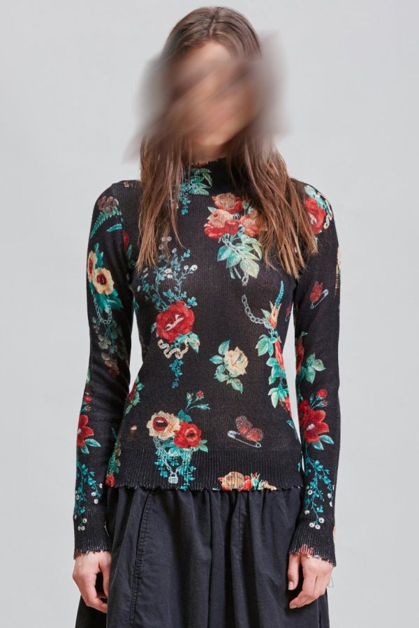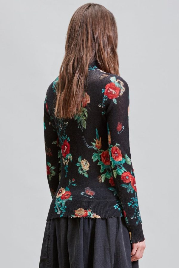 Useless Treasures turtleneck made with cashmere yarn with R13 exclusive printed pattern. Turtleneck sweater with light distressing throughout hems and cuffs.